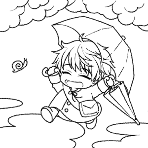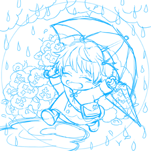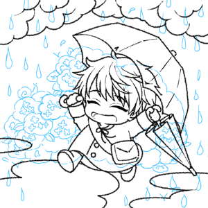 (2)ラフを元に細かい部分やかたちを整えていきます。青色で描くことが多いです。特に人物の表情は大切なのでこだわりを持って描いていきます。紫陽花や服、傘などの小物を書き込み、細部を決めていきます。