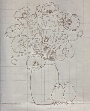 ▲ボールペンと水彩色鉛筆でラフを描く。(クリックで拡大) |
