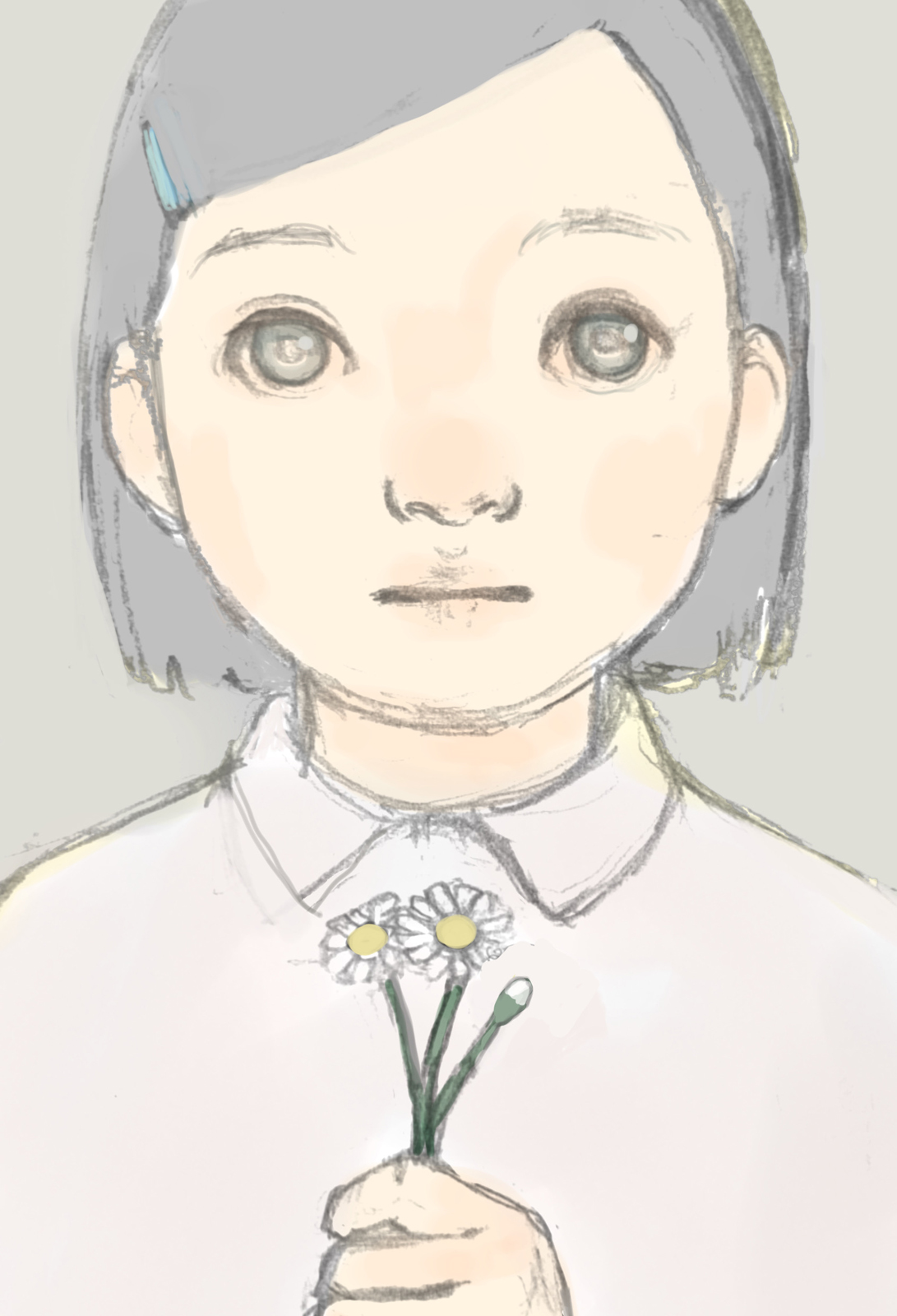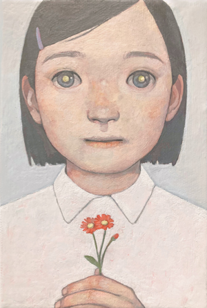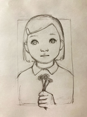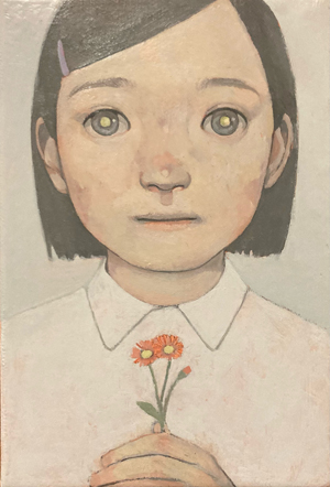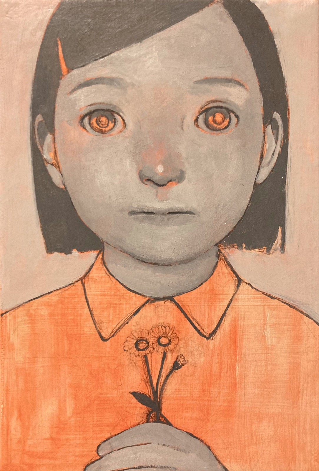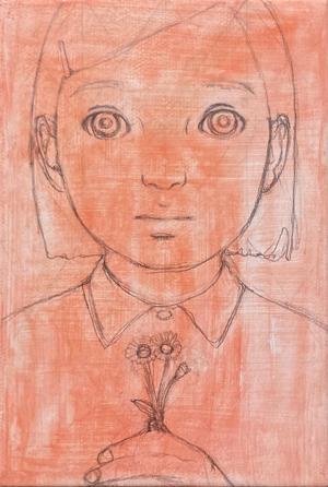 少女の絵を描いてほしいというオーダーを受けて制作しました。玄関に飾ると伺ったので、お家の方やお客さんを迎えるということを意識しつつ、何か良いことを引き込むような、お守りのようなイメージで描きました。
