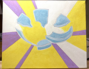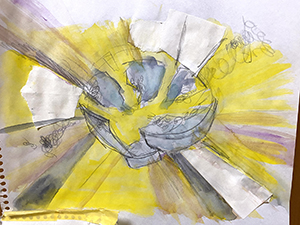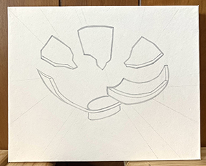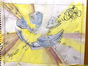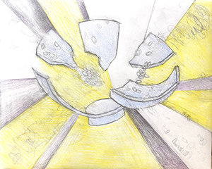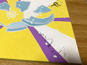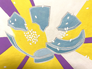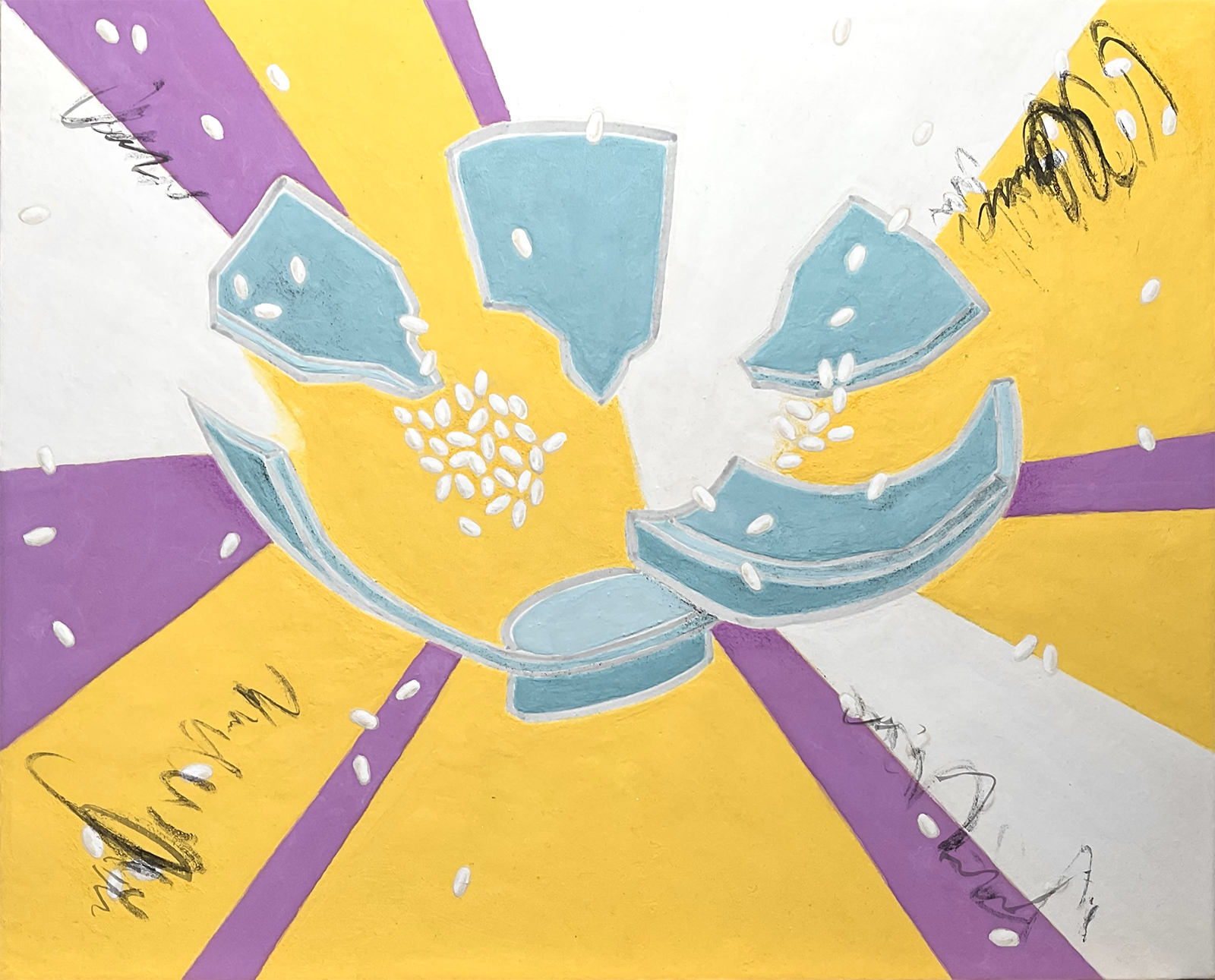 「食器が落ちて割れる」という日常の中で起こる事件から着想を得て描いた。アイデアスケッチを通して「茶碗は割れるし メシは飛ぶ」という諺めいた言葉が浮かび、割れた茶碗に飛び散るご飯を加えて描くことにした。