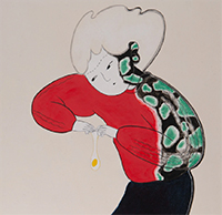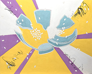 通常、茶碗が割れたことで中の「メシ」が飛び散るが、「メシ」が自ら飛び出した可能性も想像しながら描いた。日常の出来事を描写しながら自分の空想も同居させようと制作した。
