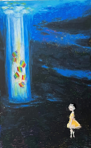 (5)全体をオイルパステルで塗りつぶします。今回は黒、青を中心に、光を表現したい部分には白、黄色、虹色を入れました。色の境目は指で直接混ぜたり、かなり自由です。