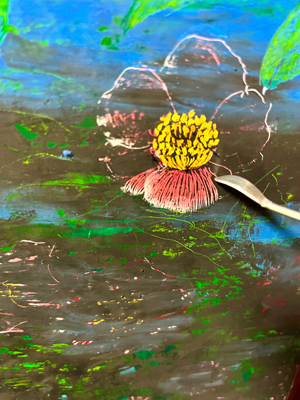 (8)保護用のニスを掛けます。オイルパステルは触ると手が汚れるのでかなり厚く被せます。ツヤ出し2回→ツヤ消し2回。ツヤ消しニスは、展示の際にスポットライトが当たると反射で光ってしまうのを避けるために掛けています。