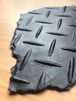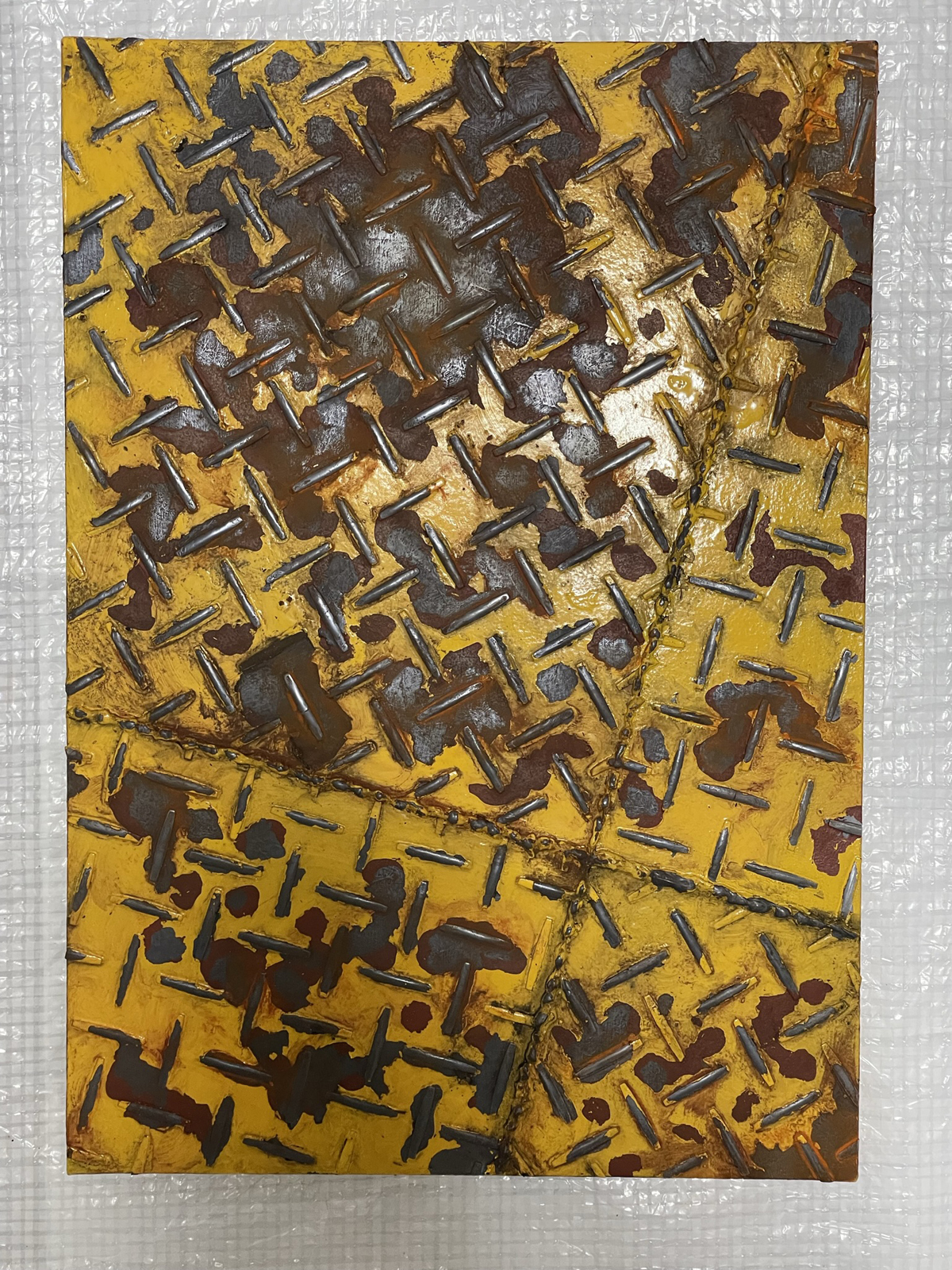 私がよく作品のモチーフとしているものとして、「縞鋼板(しまこうはん)」があります。街中でもよくある、滑り止めの凹凸のある鉄板のことです。