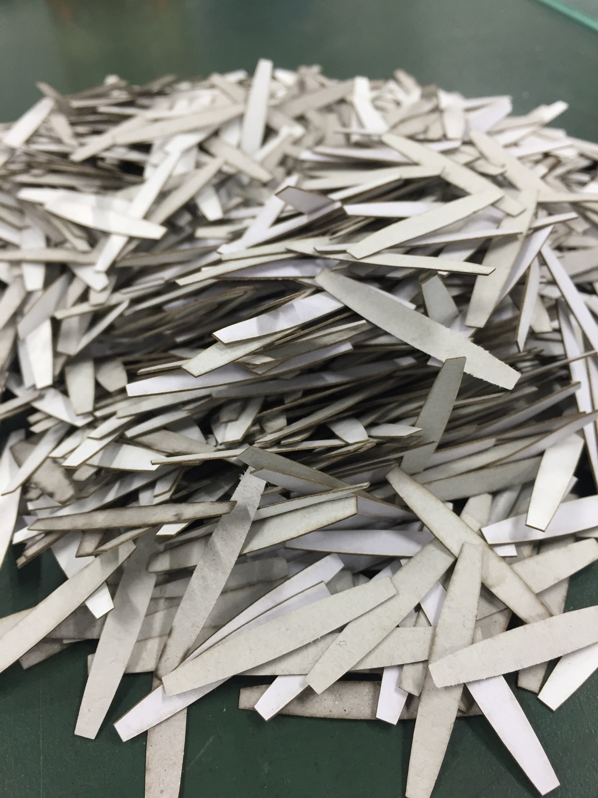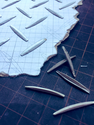 まず、あらかじめ縞鋼板の特徴でもある、滑り止めの部品を大量に作っておきます。材料は薄めのボール紙です。ボール紙を笹のような形に切り出していきます。当初は手で切り出していましたが、作品の制作量が増えてきたので、最近ではレーザー加工機を使用しています。