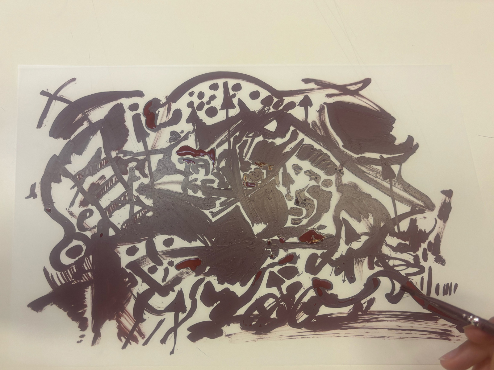(1)1版目背景:オペーク、筆、OHPフィルム、シルクスクリーン、水性インク、和紙