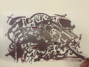 オペークインクでOHPフィルムにポジ原稿を描画します。乾いた描画部分を削ったり、ベタ面要素が多い版ですが少しモチーフを書いてみたりと遊び心を忘れず!