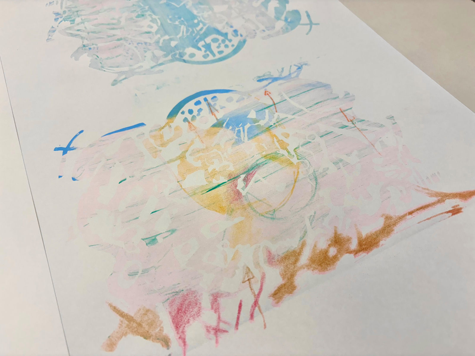 刷りは多色のインクをあえて混ぜ切らず、水彩色鉛筆で版に直接描画したものと共にマーブル状に刷り落とします。コントロールできる部分とできない部分、どちらも楽しみます。