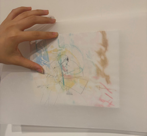 ヤニ止めをしたパネルに先ほど刷った紙を水張りします。今回はその上から色カーボン紙を使用しドローイングを転写。日頃から描き溜めているドローイングから抜選。