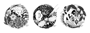 2作品ずつ同時に進行します。コピックマルチライナー0.05mm / 0.1mmをメインに使用。トレースダウン時にしっかり下描きを書いているので、それに沿って黒に塗りつぶす部分、ペンの掠れをつくるグラデーションの部分を、全体のバランスを見ながら描画していきます。白面が多いより黒面が多い方が全体が引き締まって好みです。