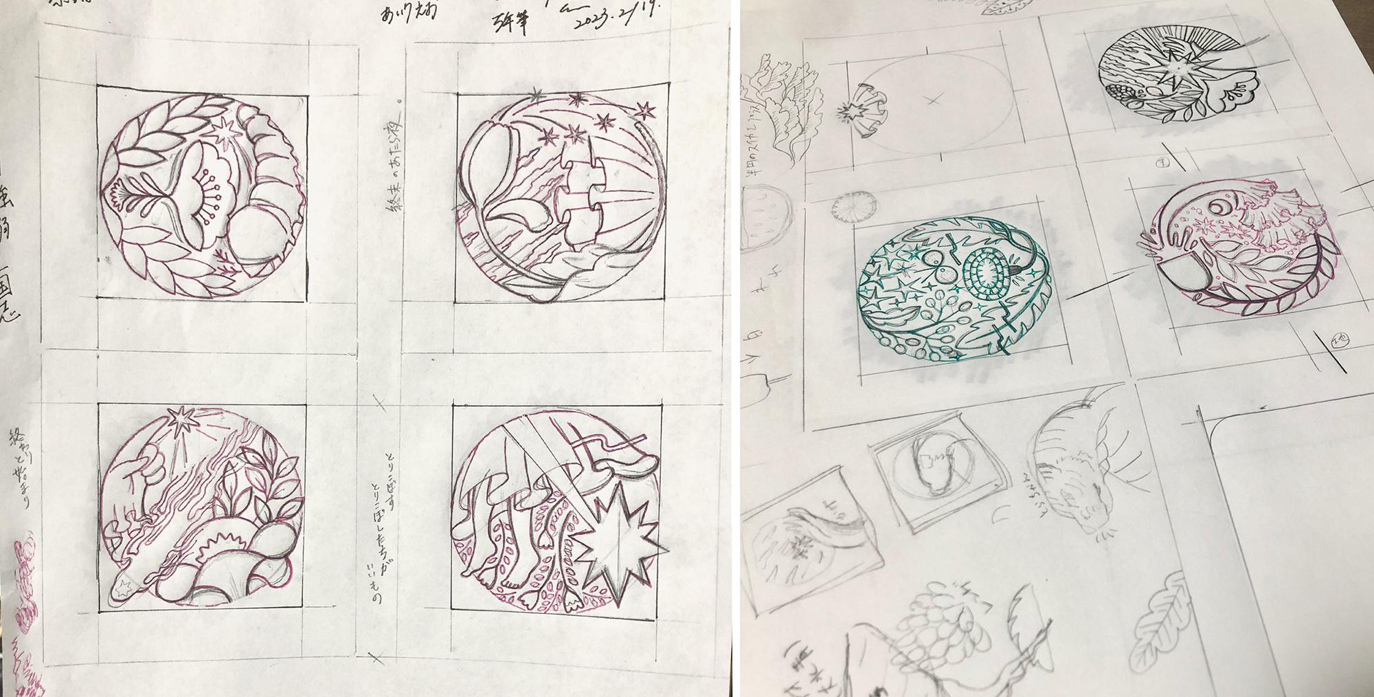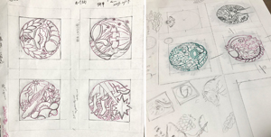 スケッチブックに手描きでラフを制作。言葉からイメージを広げることも多いです。今回ミニ原画なので入れるモチーフをさらに絞りました。またiPadでラフを制作する場合もあります。今回下記ラフ画像を描画していきます。