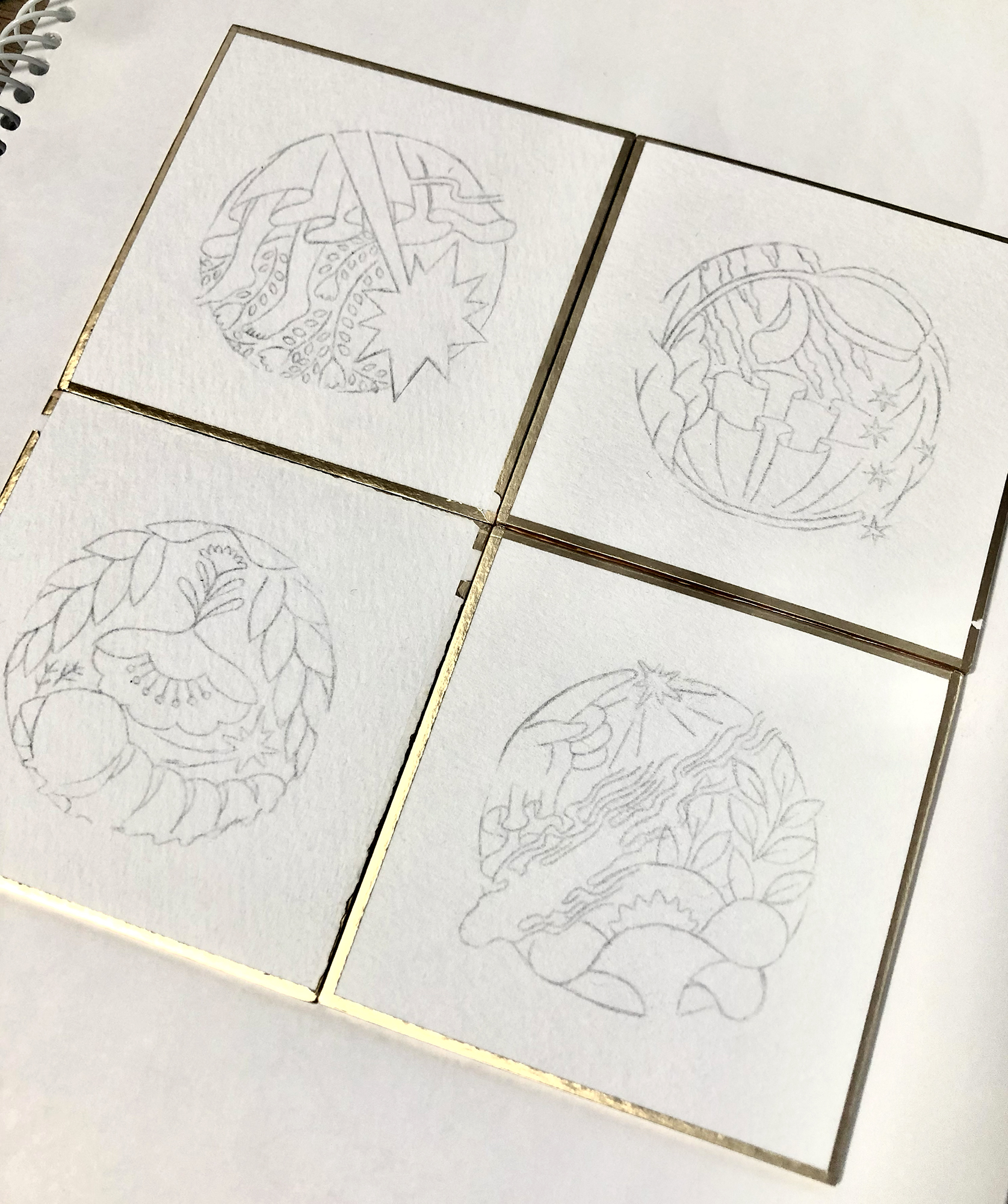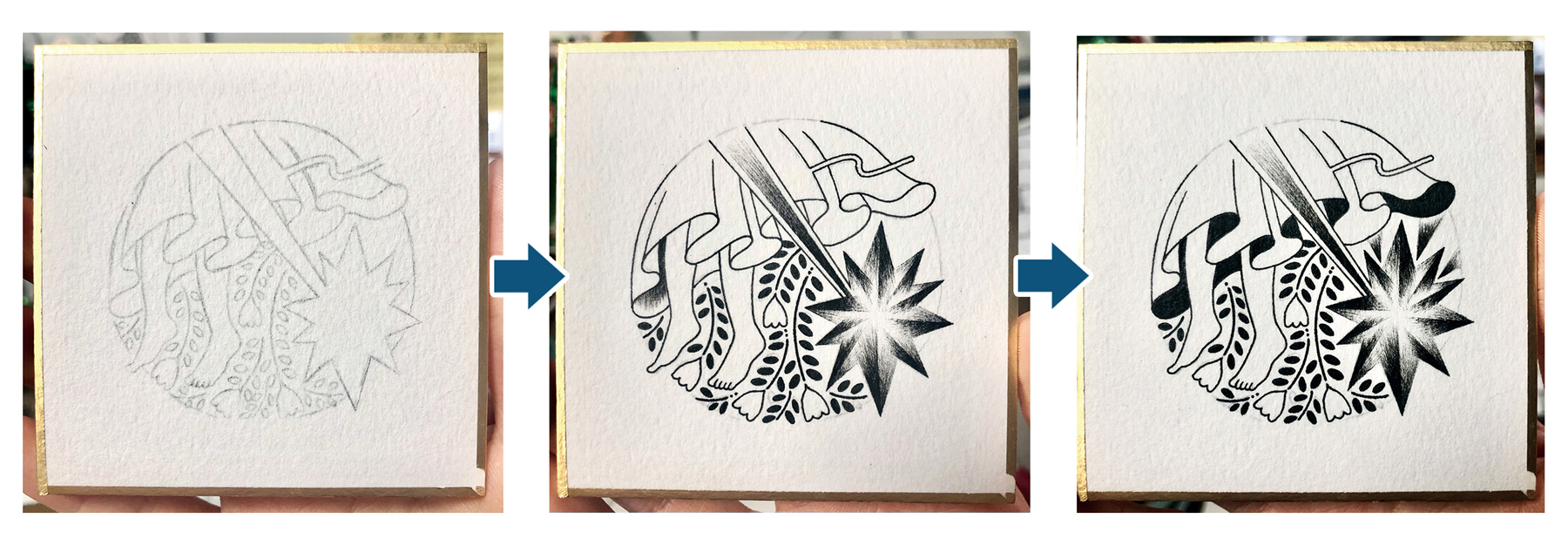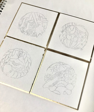 ラフの裏面を濃いめの鉛筆で塗り、細めのゲルペンでなぞりカーボン紙の役割としてミニ色紙に写し下描きを制作します。個人的に一番しんどい作業。