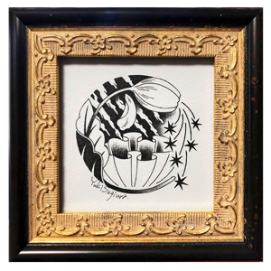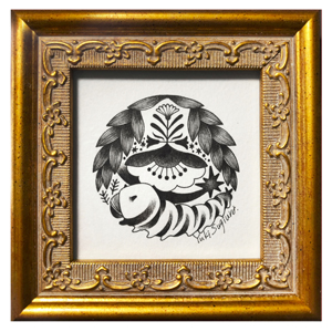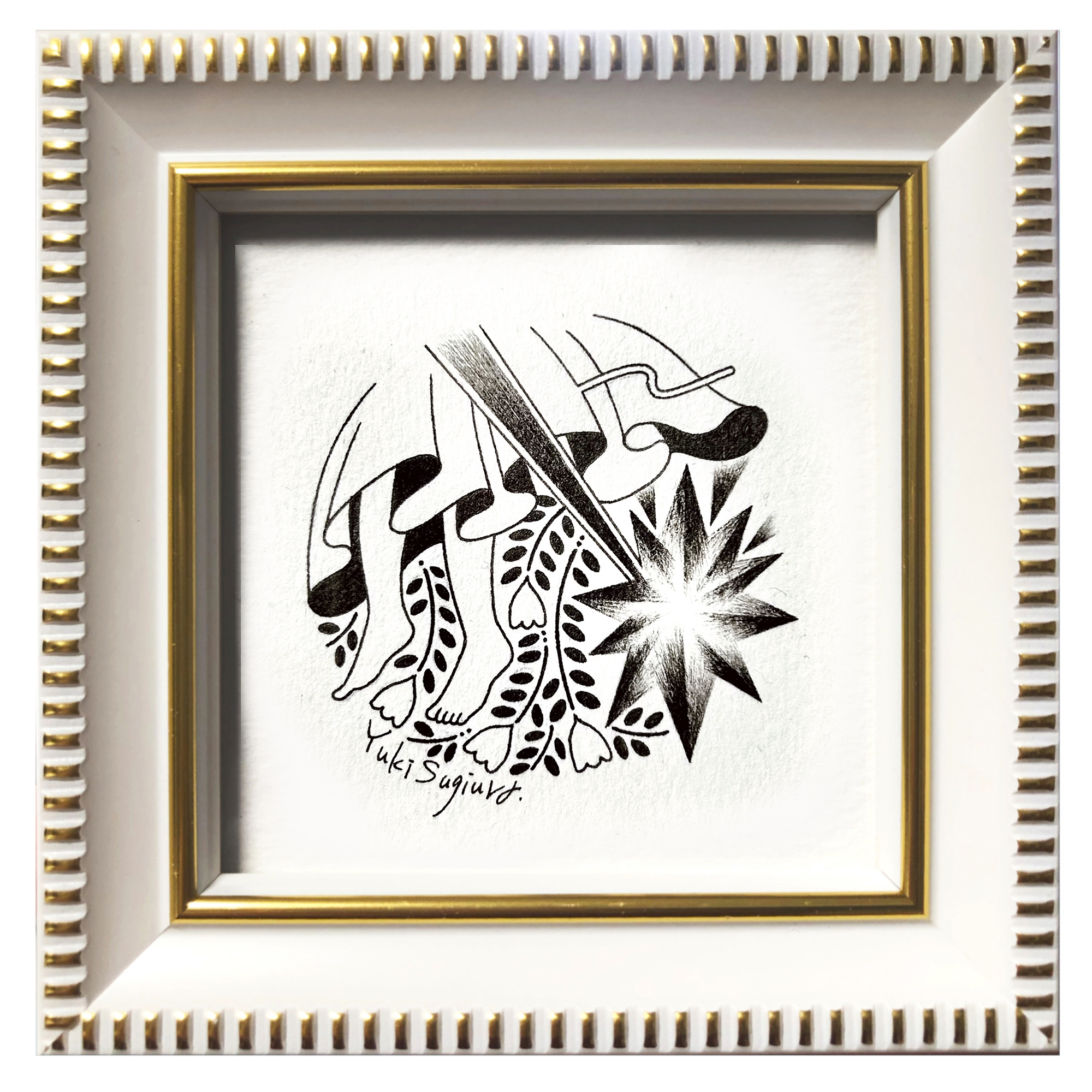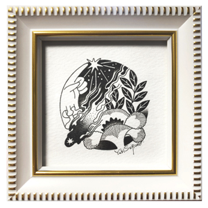今回のミニ原画の構想は、以前から描いている「夜×動植物×小さな夜の子の気配」の3つのモチーフに円でまとめているペン画となり、「円夜」シリーズと呼んでいます。小さな夜の子は顔や胴体は描かず、手や足などで“気配”として入れており、「自分の中の気持ちいい線を描く」心掛けています。