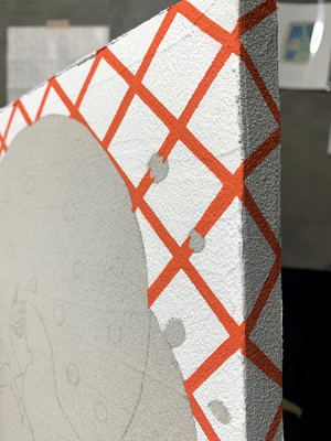 いつも描く時にこだわっていることは色ムラや線の揺らぎを出さないように塗ることです。今回は下地がガタガタなので普通に塗ると砂に邪魔されてガタガタの線になってしまうので、1mmくらいの砂の隙間を地道に塗り正面で見た時に線が歪みなく真っ直ぐ見えるように調整しながら塗りました。