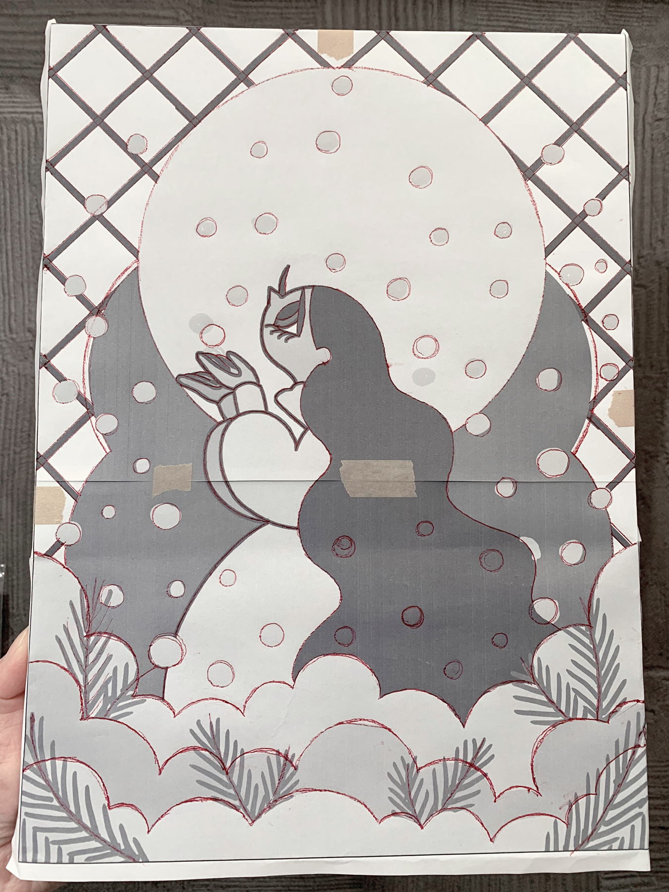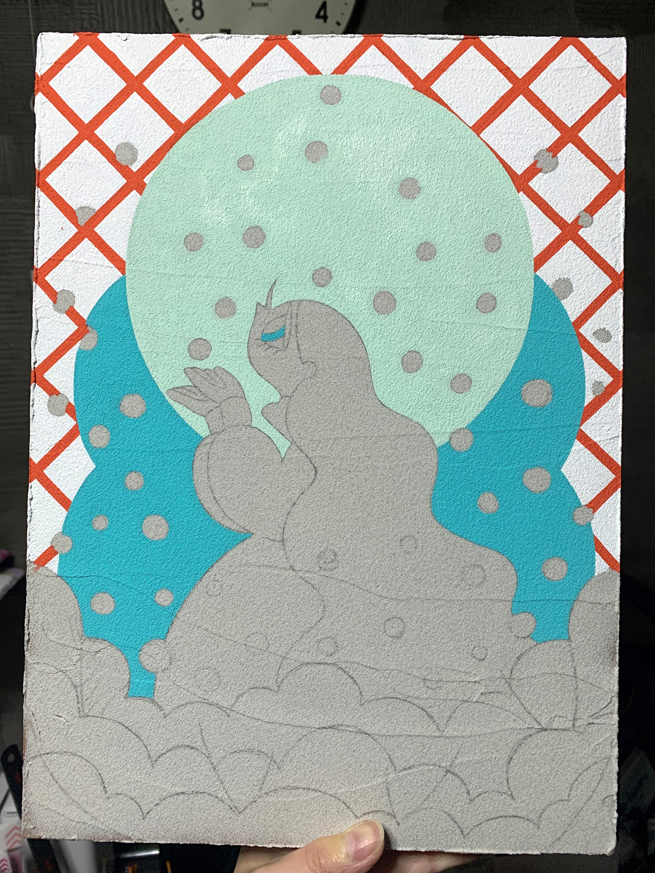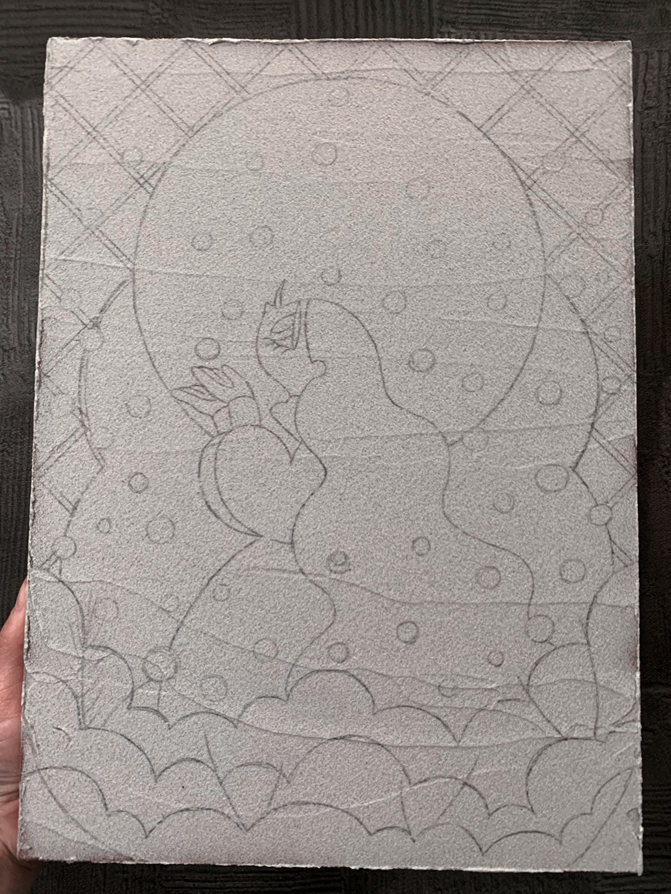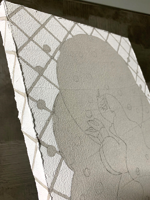 白黒でプリントした下絵の裏を鉛筆で塗りつぶし、ボールペンでなぞってトレースダウンします。下地が細かい砂でできたメディウムなのでガタガタしていて描きにくいです。