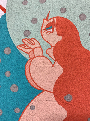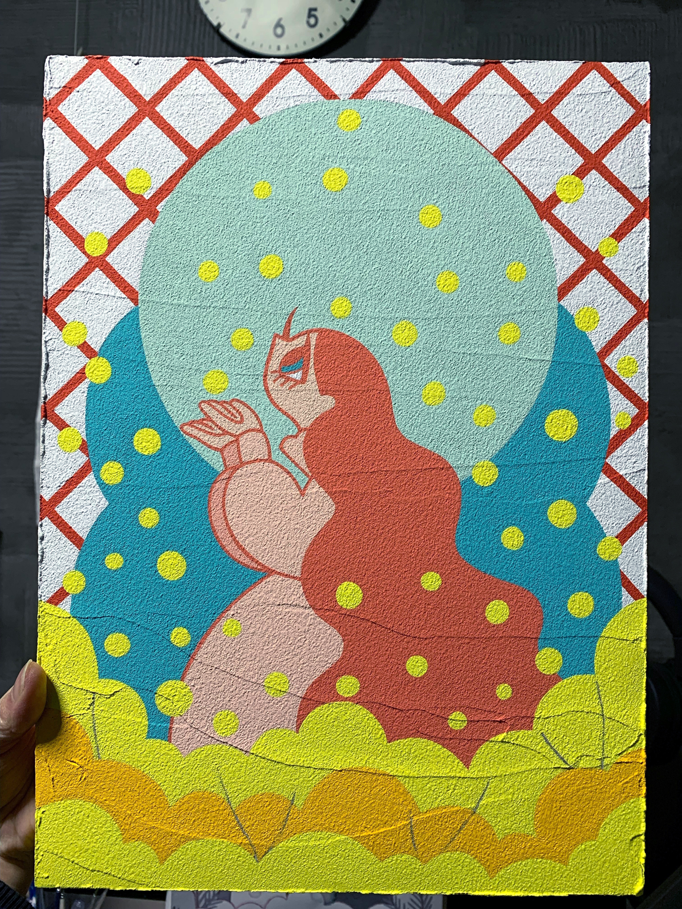 アクリルガッシュ、筆、セラミックスタッコ(メディウム)、F4サイズの木製パネル、鉛筆、ボールペン、Photoshop。