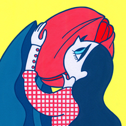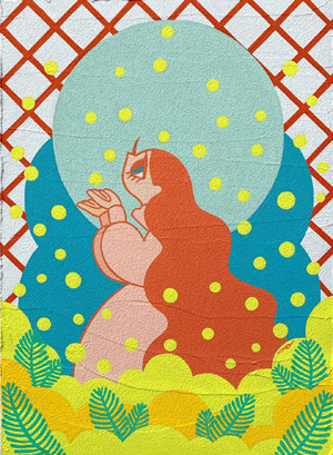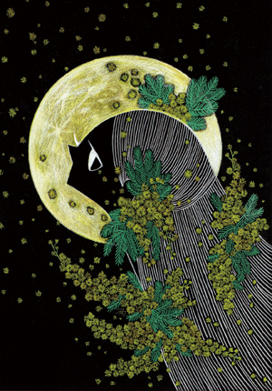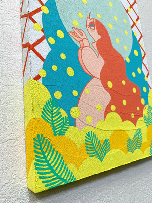 あと今回の企画展を企画&開催するギャラリーのイメージカラーが赤なので、どこかに赤を入れようと考えました。結果、ミモザは春の柔い青空の下で光っているイメージし、柔らかく輝くという意味の「glow」というタイトルに決め、青空に浮かぶ日中の月に舞い上がっていくようなイメージで描きました。