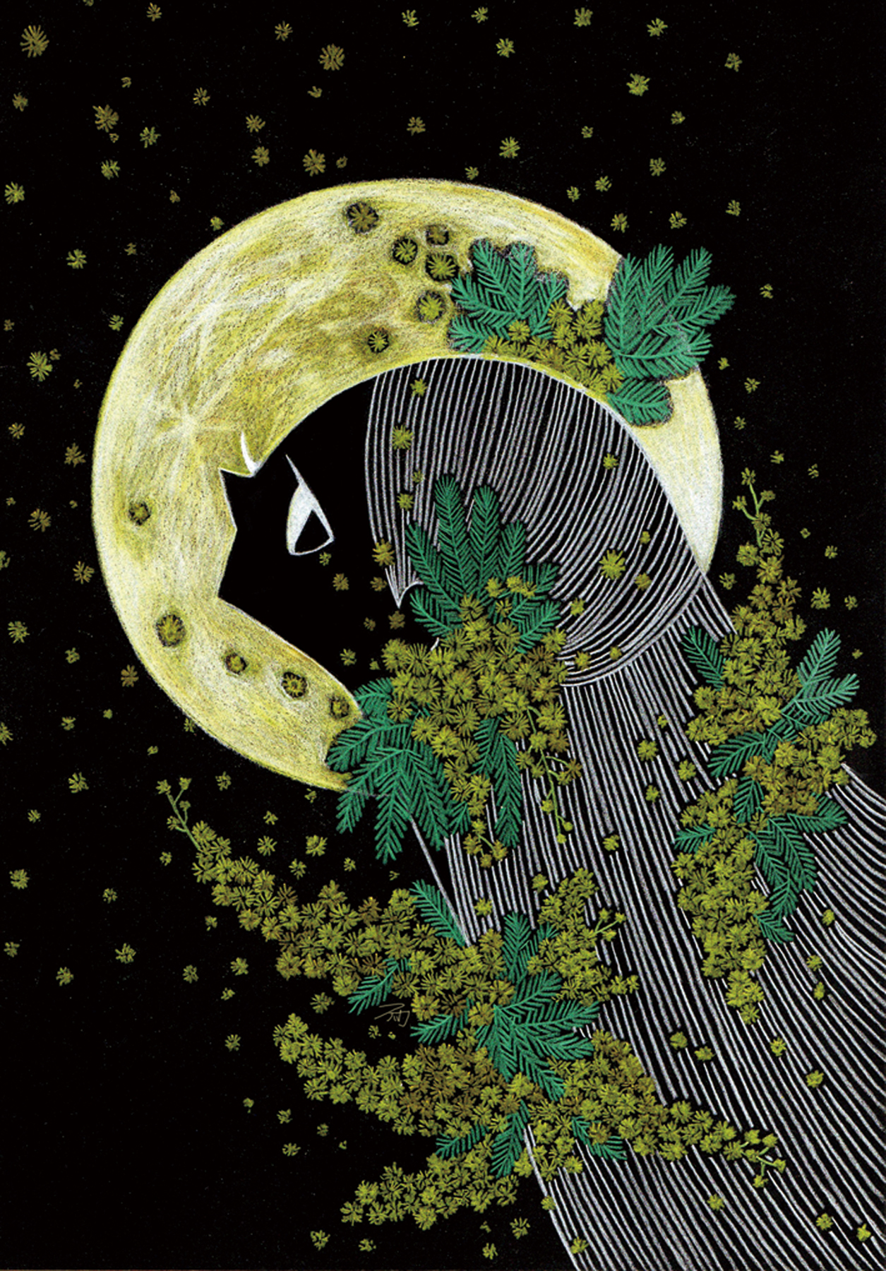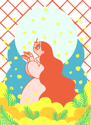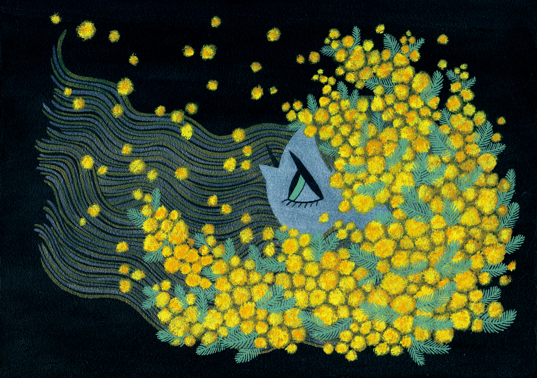 今回描く作品は「Thanks Mimosa」というタイトルのミモザをモチーフにした企画展に出品するものです。いつもミモザの絵を描く時は暗い背景にしがちなので、今回は明るい色味にしようと決めました。ミモザの丸く見える花から全体的に丸を多く使うようにして、「降り注ぐ」や「舞い上がる」などのイメージからミモザの花が効果的に見えるような構図を考えました。