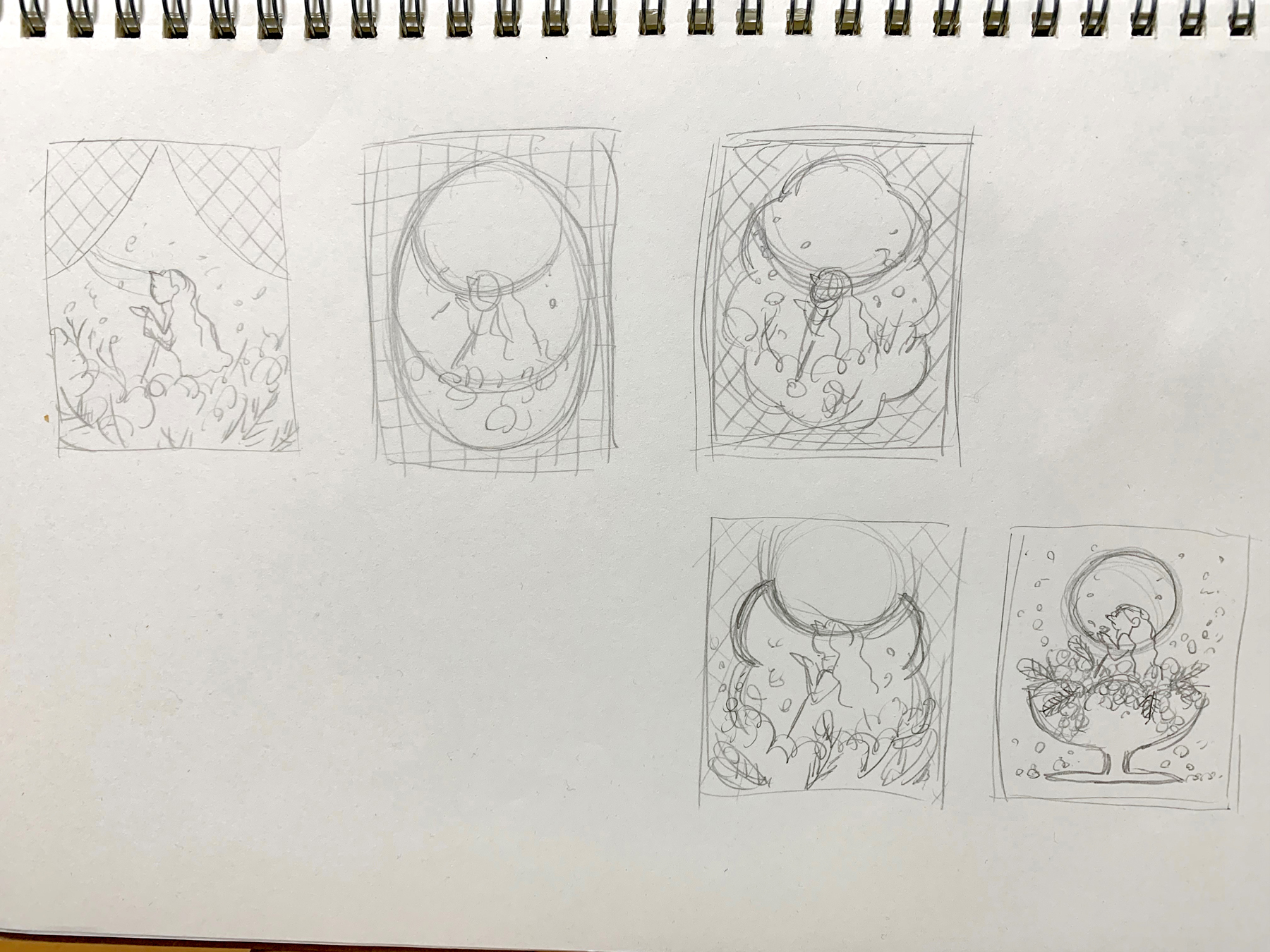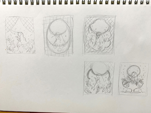 頭の中でだいたいのイメージや配色が固まったら、スケッチブックに手描きでいくつか案を描き出していきます。