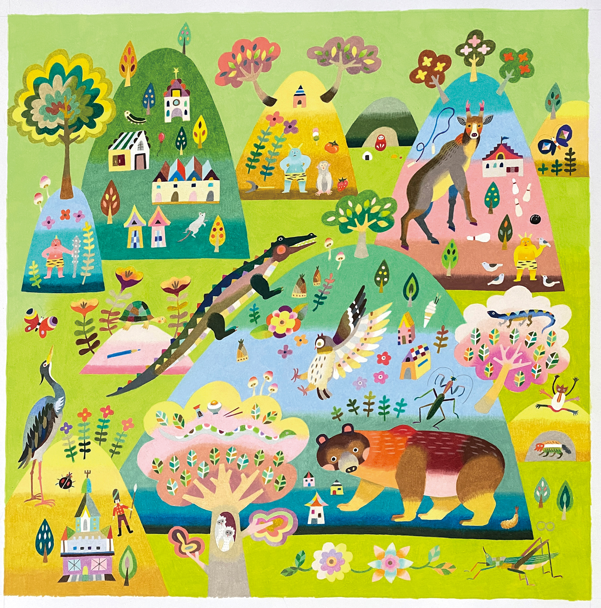 今回はハンカチのデザインだったので、折り畳んでも何かしら絵が見えるように、全体的に絵柄を入れました。