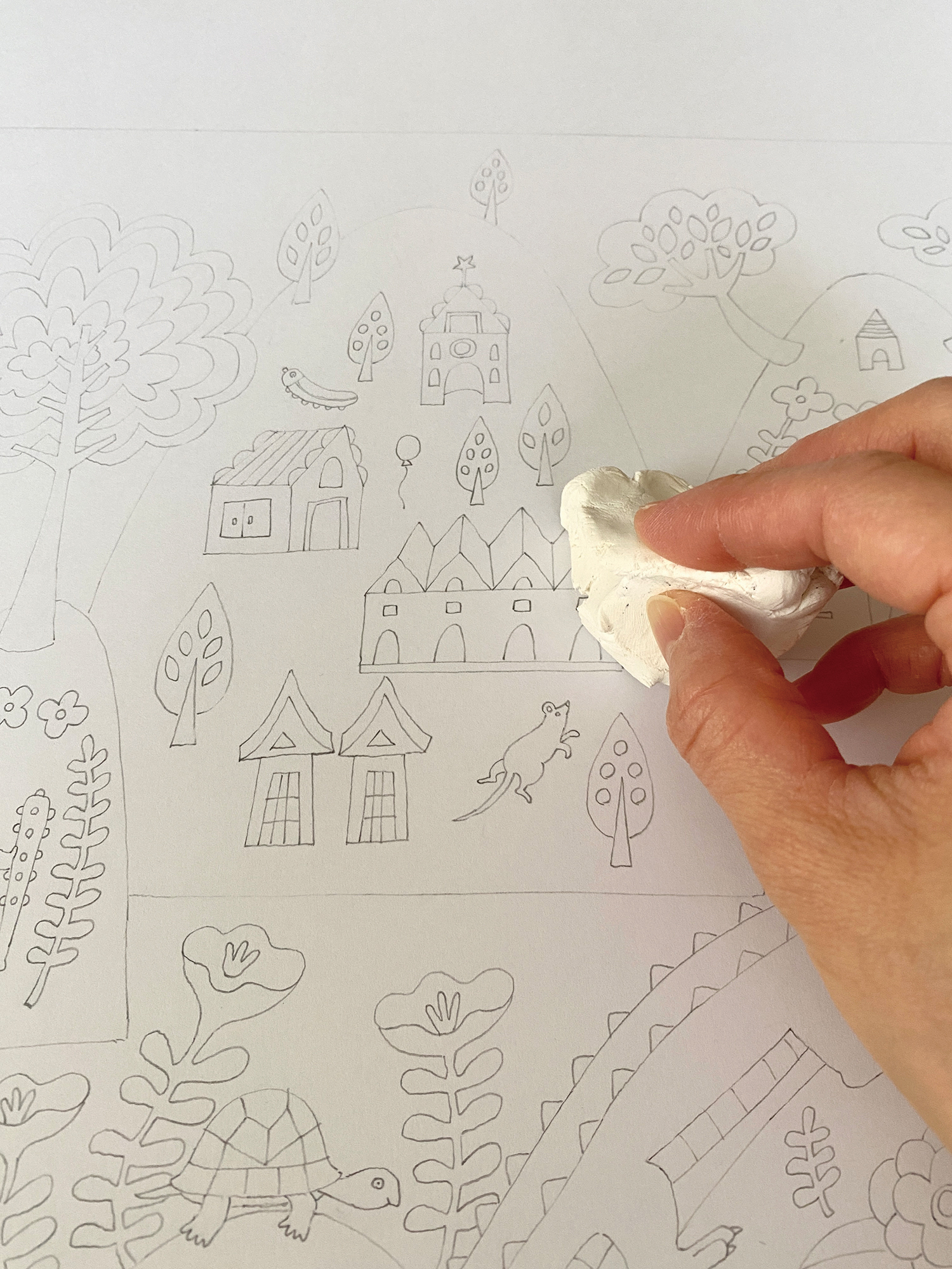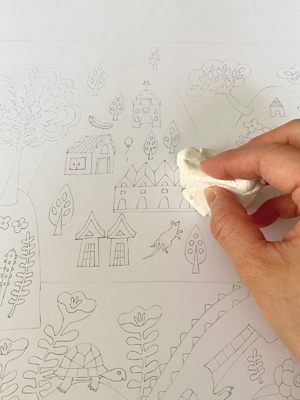色鉛筆で着色をする前に、鉛筆で描いた下描きの縁を練り消しで軽くトントン叩きながら薄く消します(完全に消えないように注意)。そうすると色鉛筆の色が綺麗に発色します。