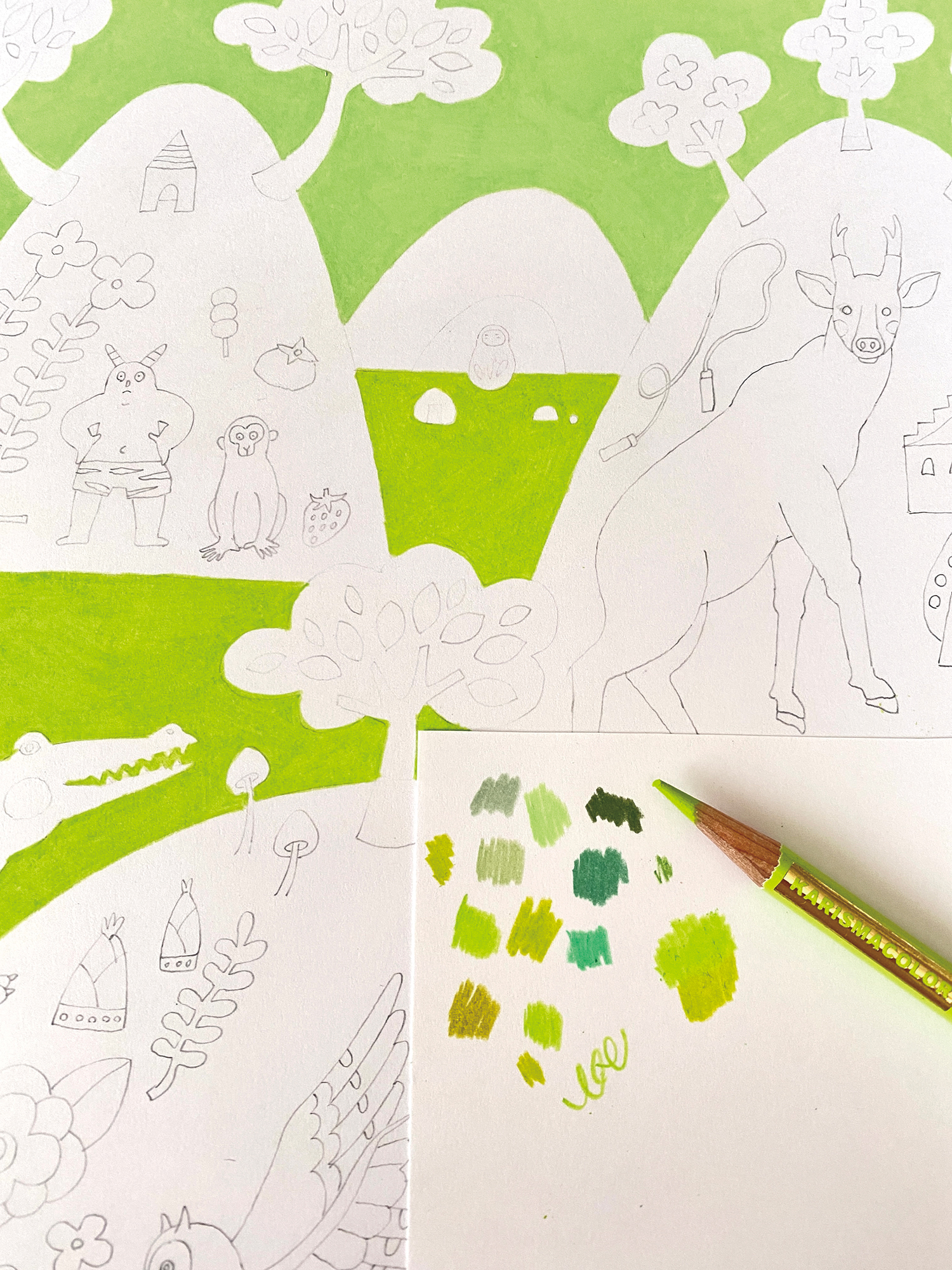 (2)着色も、塗り進めながらバランスを取っていきます。私は色鉛筆のそのままの色が好きなので、混色せず、純色のまま使います。