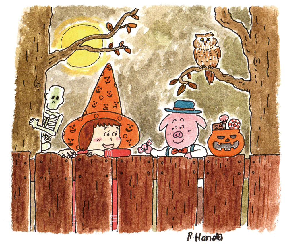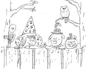 大きなサイズの絵ではないので、決まったスペースの中に分かりやすく描きたいものを配置しました。真ん中に仮装した女の子と豚くんが仲良くお菓子の交換をしている様子を描き、背景にはハロウィンらしいアイコンのガイコツやフクロウを、ヨロヨロした木とセットで描きます。女の子の帽子は、ハロウィンの子供の仮装写真を見たりしてヒントを得ました。