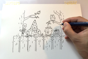 お客様からラフOKの返事をいただくと、早速本稿に入ります。できたラフをトレース台に載せて、ペン入れをします。後に水彩絵具で彩色するのでここで使うペンは耐水性になります。ペンで表現したい部分と筆で表現したい部分を考えながら毎回絵を描いていきます。今回はペンで基本的な楽しい雰囲気を描き、後に水彩絵具でハロウィンの少しドロドロしたテクスチャを描こうと思っておりました。