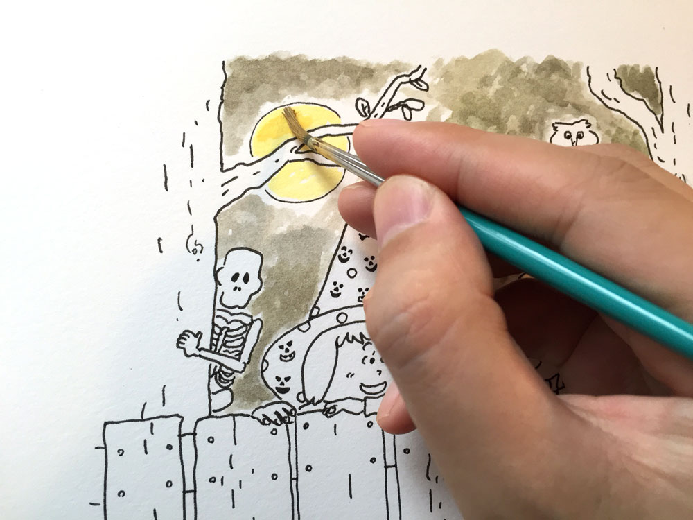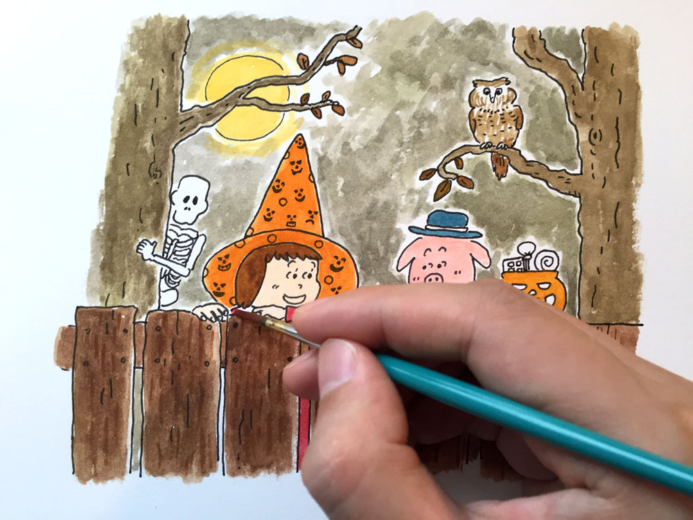 水彩絵具で色をつけ始めます。私は大抵背景から色を付け始めるのですが、今回は服装やお菓子などでビビッドな彩色をするつもりだったので、空や木はできるだけ自然色で配色しました。また、月夜をバックに描くことで、絵の中のモチーフにほどよい影が付き、なによりハロウィンらしさ演出することができます。