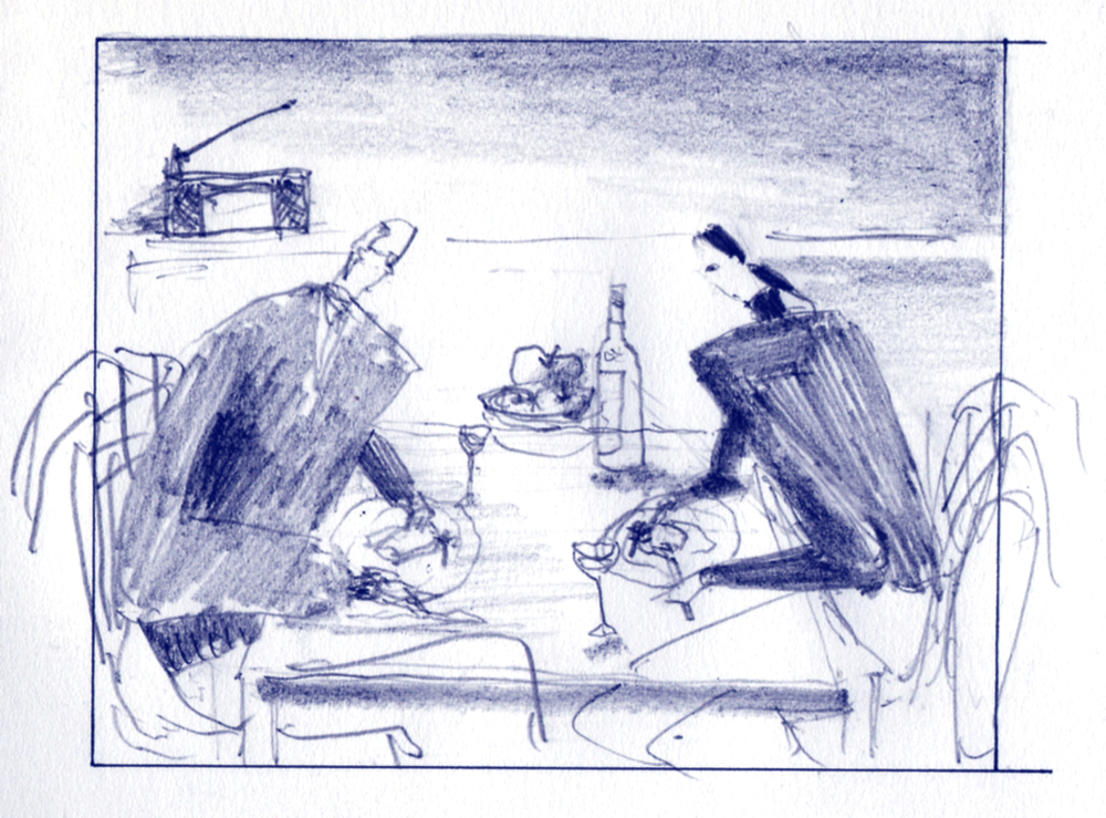 この時点で自分でも気になった箇所は本番で修正をしていきます。この時は構図がシンメトリーになって第三者の目線に見えるのを、少し著者側(女性側)にずらすことでどちらのストーリーなのかを見る人に伝えるために構図の変更をしました。