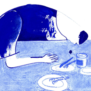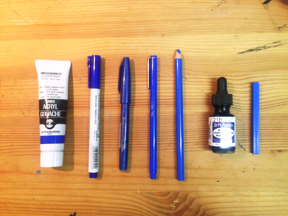 ・画材 青やモノクロなど1色で描くことが多いので、同じ色の画材の中でも複数の画材を揃えます。青の場合よく使用するのはウルトラマリンブルー・ロイヤルブルーのアクリルガッシュ、インク、パステル、色鉛筆、サインペン、ミリペンなどです。同じ色名で販売していても微妙に色相が違うので一見単色に見えますが深みのある画面になります。