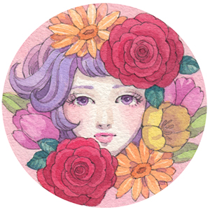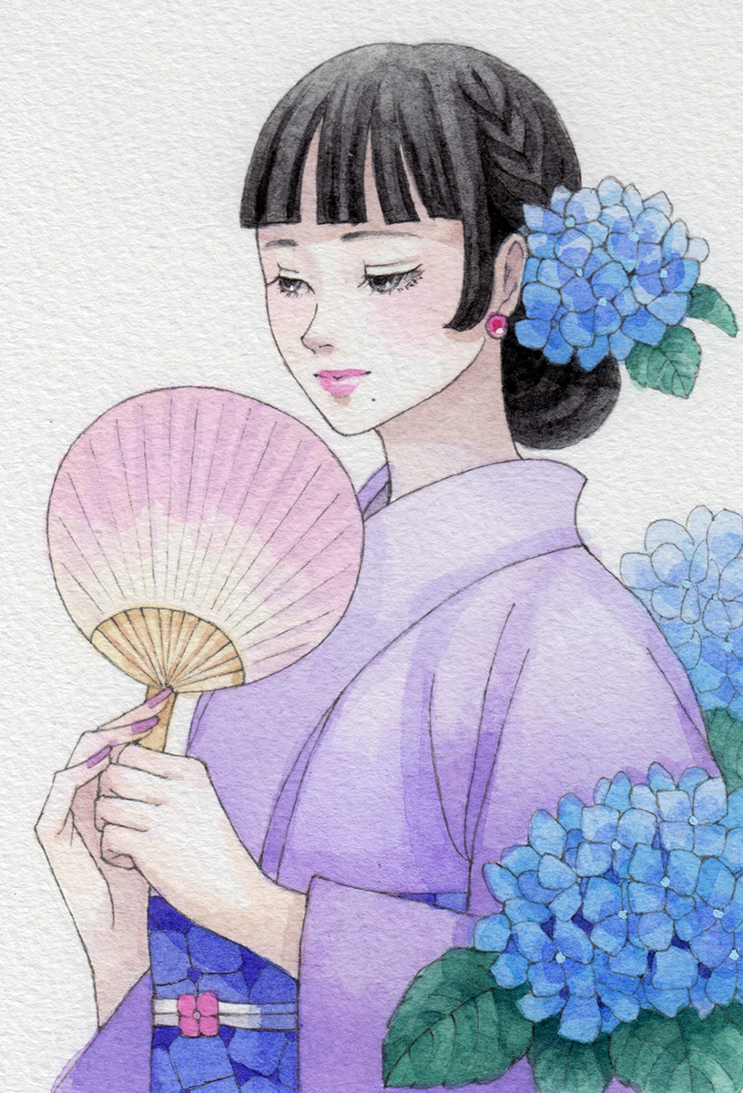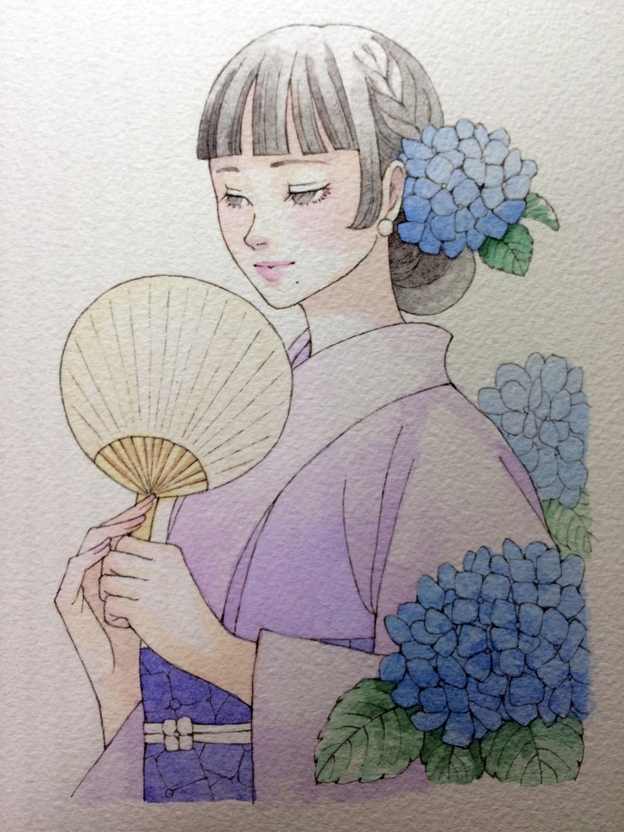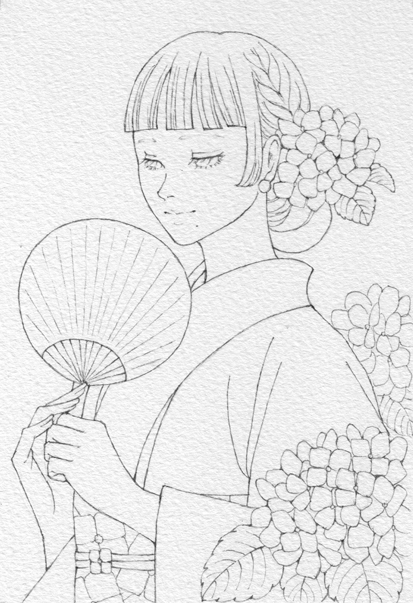 今回のモチーフは、これまでによく描いている「着物女性とお花」で、季節感を意識して構成しています。