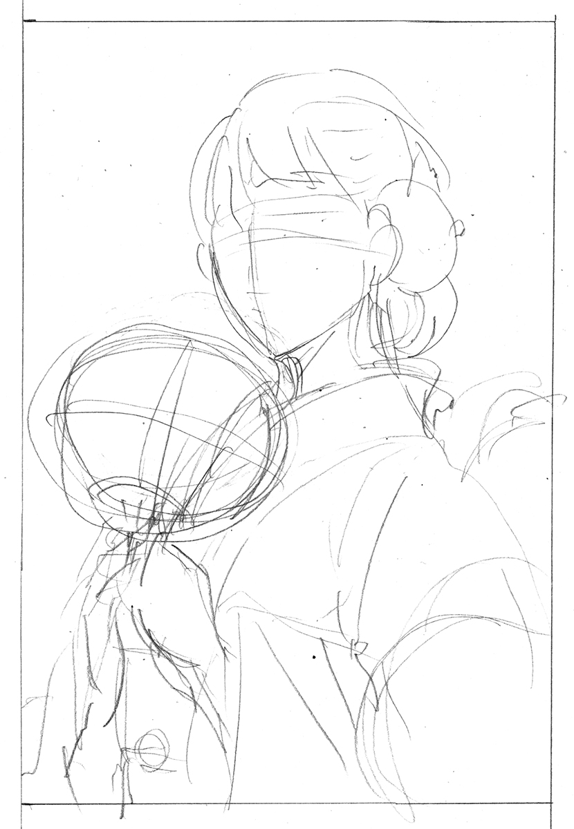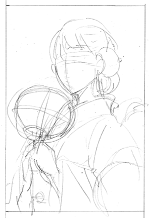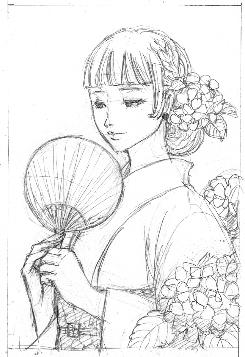 構図のあたりがついたら、人物や花を細かく描き込み、下書きが完成です。(画像3)
