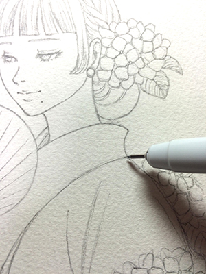 木製パネルに水張りしたアルシュ水彩紙に下書きをトレースし、転写された鉛筆の線に沿って、グレーのミリペンでペン入れを行います。(画像4)