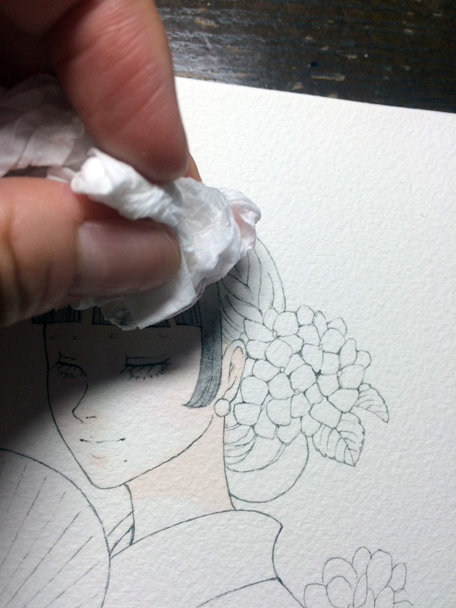 水を多く含んだ筆で色をのせては、ティッシュペーパーで余分な色(水分)を拭うという作業を繰り返します。(画像8)