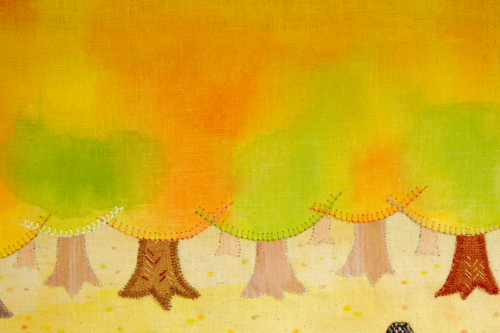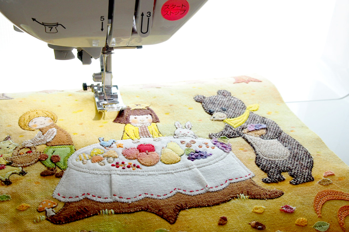 そこから、私はほとんどの場合ミシンを利用して(駆使して)描きます。5mmくらいまでのパーツであればミシンで縫い留めることができます。そのため、大きなものから小さなものまで対応できますし、作業もアナログとはいえ、速いほうだと言われます。手刺繍を用いるのは主に質感で必要な時と、人物の表情入れ、ミシン針の穴が目立たないほうがいい繊細な作業のときです。