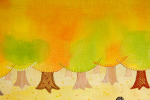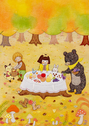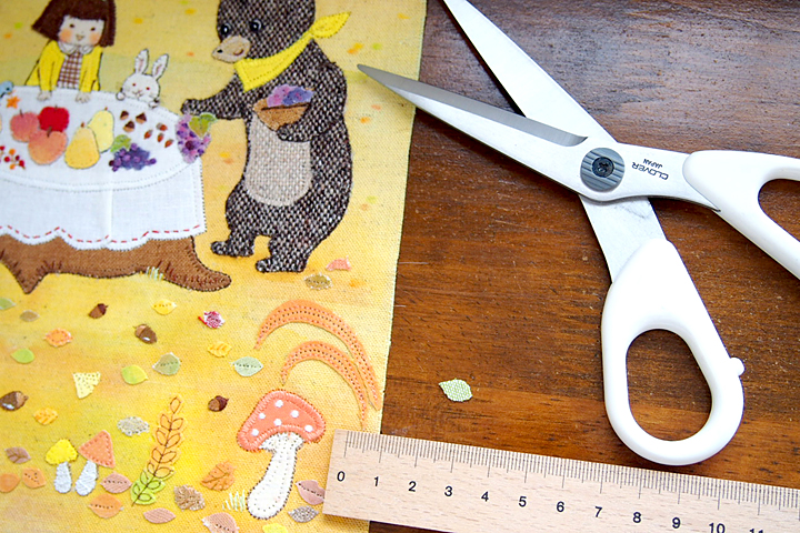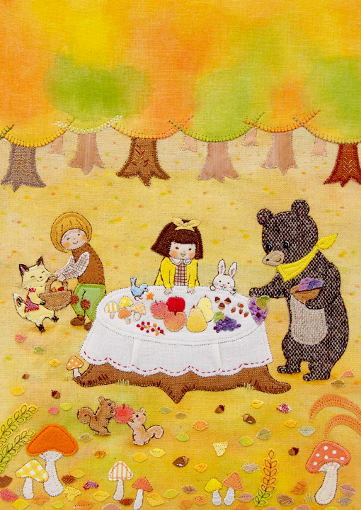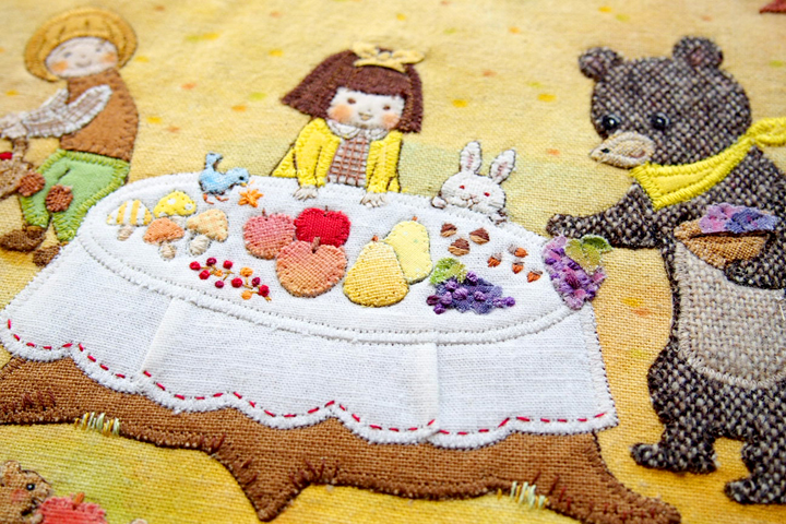 素材選びはいつも気を遣う部分です。布でも、布目が細かいものやざっくりしたもの、薄いもの、厚みのあるものと幅広いですし、色もさまざまで、この絵には何が一番合うのかを考えます。ラフの色味と手持ちの布のイメージが合わないこともあるので、毎回試行錯誤です。今回は、紅葉のグラデーションや素材感(クマにツイード生地、テーブルクロスにシワを寄せるなど)で、布絵だと感じていただけることを意識して描きました。 布で描いていても、表情や仕草は硬くならないよう、柔らかく描くことを常に心掛けています。