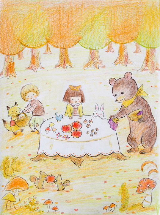 ラフは紙に手描き(色鉛筆、水彩ペン)で作成することが多いですが、Photoshopで着彩することもありますし、実際にパーツのイメージを作った上で、ご提案することもあります。今回は、「秋の号(10月号)なので、秋の風景を子供や動物を交えて賑やかに描いてほしい」というご要望でした。月刊絵本の副読本であることから、お子さんから親御さんに親しまれるよう、秋の味覚を持ち寄ったパーティが開かれている森のワンシーンを描くことにしました。