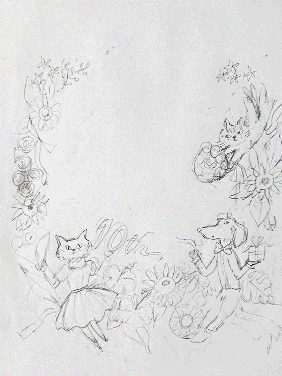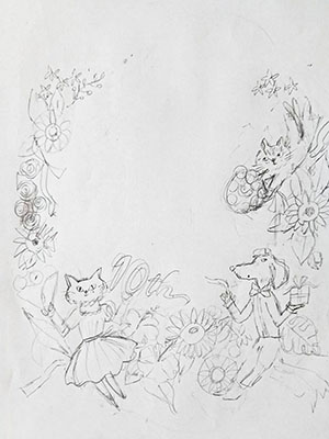 アイデアを出し、さまざまなポーズを描いてみます。その中からメリハリがあるポーズで、いきいきと見えるものをチョイス。最初に人物、動物の場所を決めて落とし込み、合わせて、植物、リボンの位置を決めておおよその構図を鉛筆で描いていきます(このとき、全体の仕上がりをイメージしておく)。臨場感あふれる作品に仕上げたかったので、下描きの段階であまり細部まで決め過ぎないようにしました。
