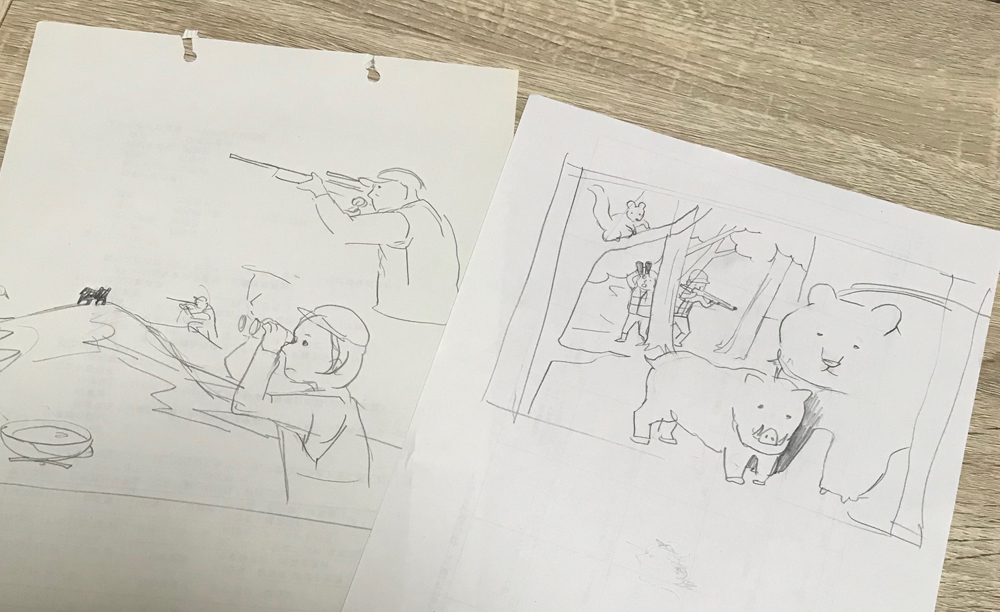 ラフを2、3枚描いたら執筆者と編集者に送ります。修正や指定がある場合もこの段階で言っていただきます。今回は1枚目の動物が前面にいる構図のものになりました。