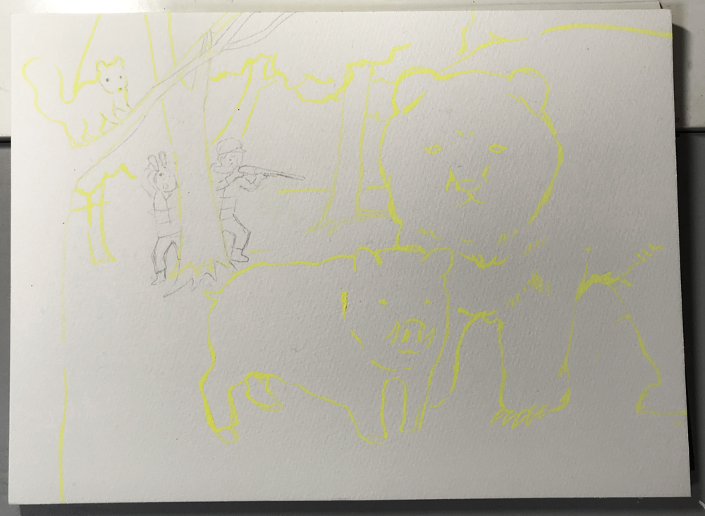 水彩紙に黄色で本描き。(クリックで拡大) |
