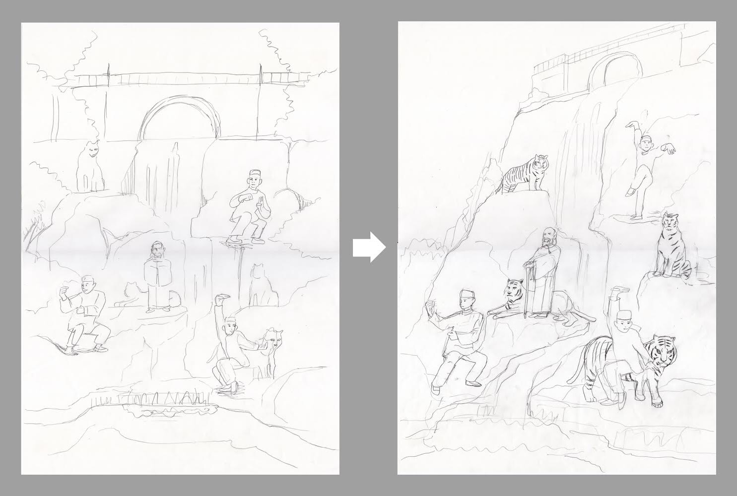 ラフを描き、構図を決めていく。(クリックで拡大) |