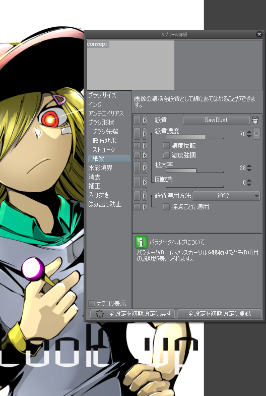 ブラシ設定の「紙質」で面白いブラシを試してみる。(クリックで拡大) |