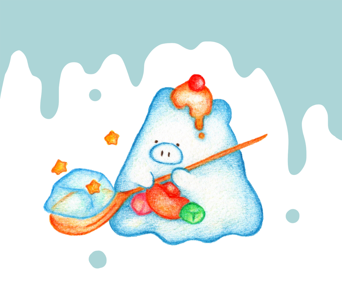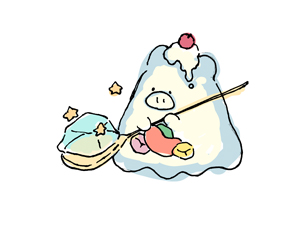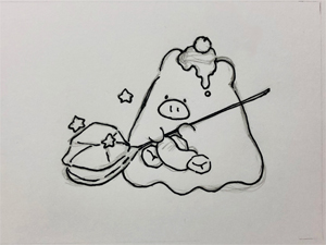 動物+食べ物で考えることが多いです。今回は夏に出すグッズ用のイラストなので、ゼリーとブタをモチーフにしたキャラクターを描きました。