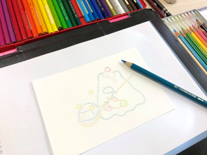 色鉛筆はコントロールしやすく+きちんと色を乗せるために削って尖らせておきます。トレース台を使って濃い色で線を引いた後は、薄い色を先に平塗りで塗る→濃い色を重ねてグラデーションを作る→線を整える の繰り返しになります。