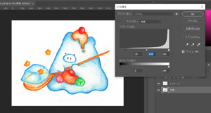 完成したイラストをスキャンします。スキャンのみの状態だと実物のイラストの色よりも全体的に暗いので、Photoshopで彩度の調整とレベル補正をして切り抜き、CLIP STUDIO PAINTで装飾を描いて完成です。