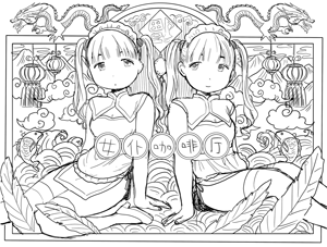 色を全体に置いてバランスを見てから影やハイライトを入れます。人物の色を塗るのは一番最後です。チャイナ服の色は2人で色違いにしようと思っていましたが、白が基調のチャイナ服にして、背景と色が混ざらないようにしました。人物が目立つようにしたいからです。