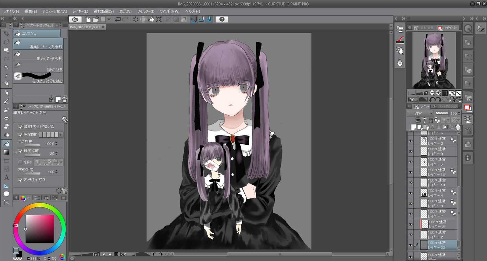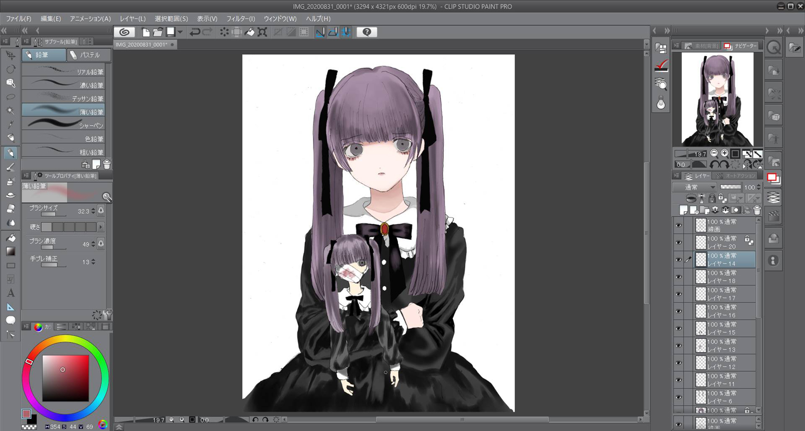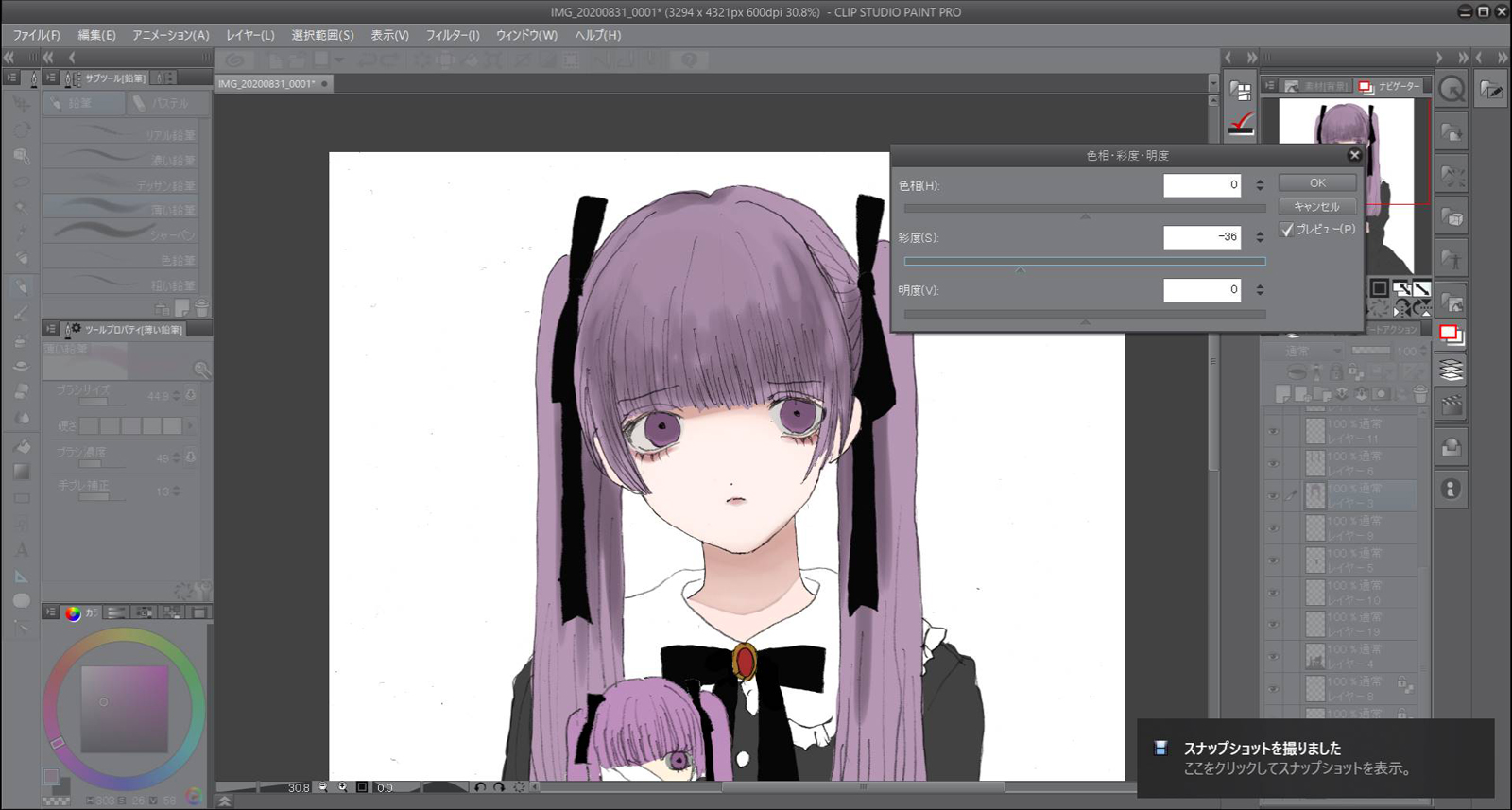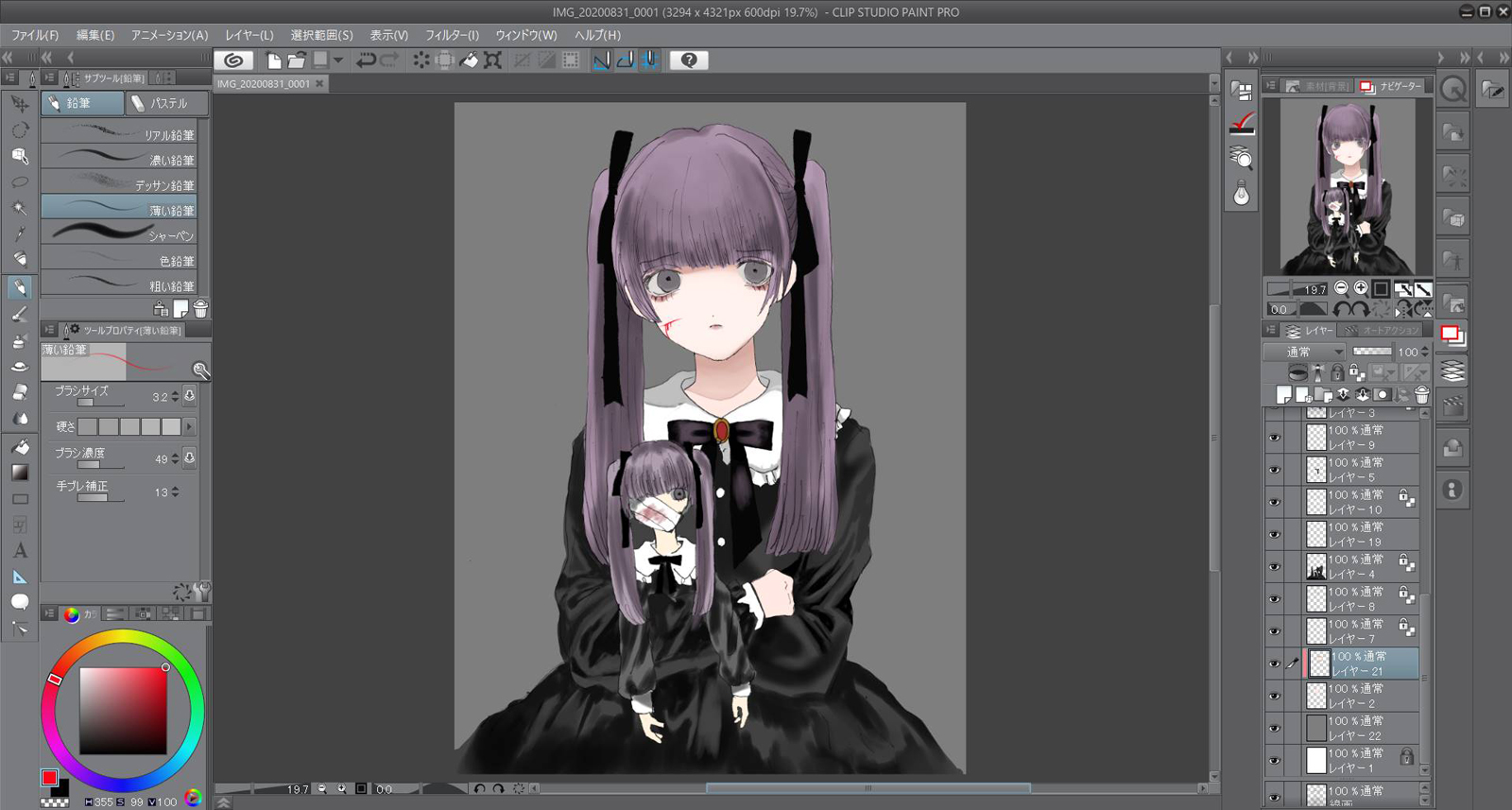 目の下には赤のシャドーを使いました。軽く明暗を書き込んだら色調整をするために彩度を低くします。これによってよりダークな印象をつけます。人形の服の色も黒なので別の服ということを分かりやすくするため明るめにします。 。