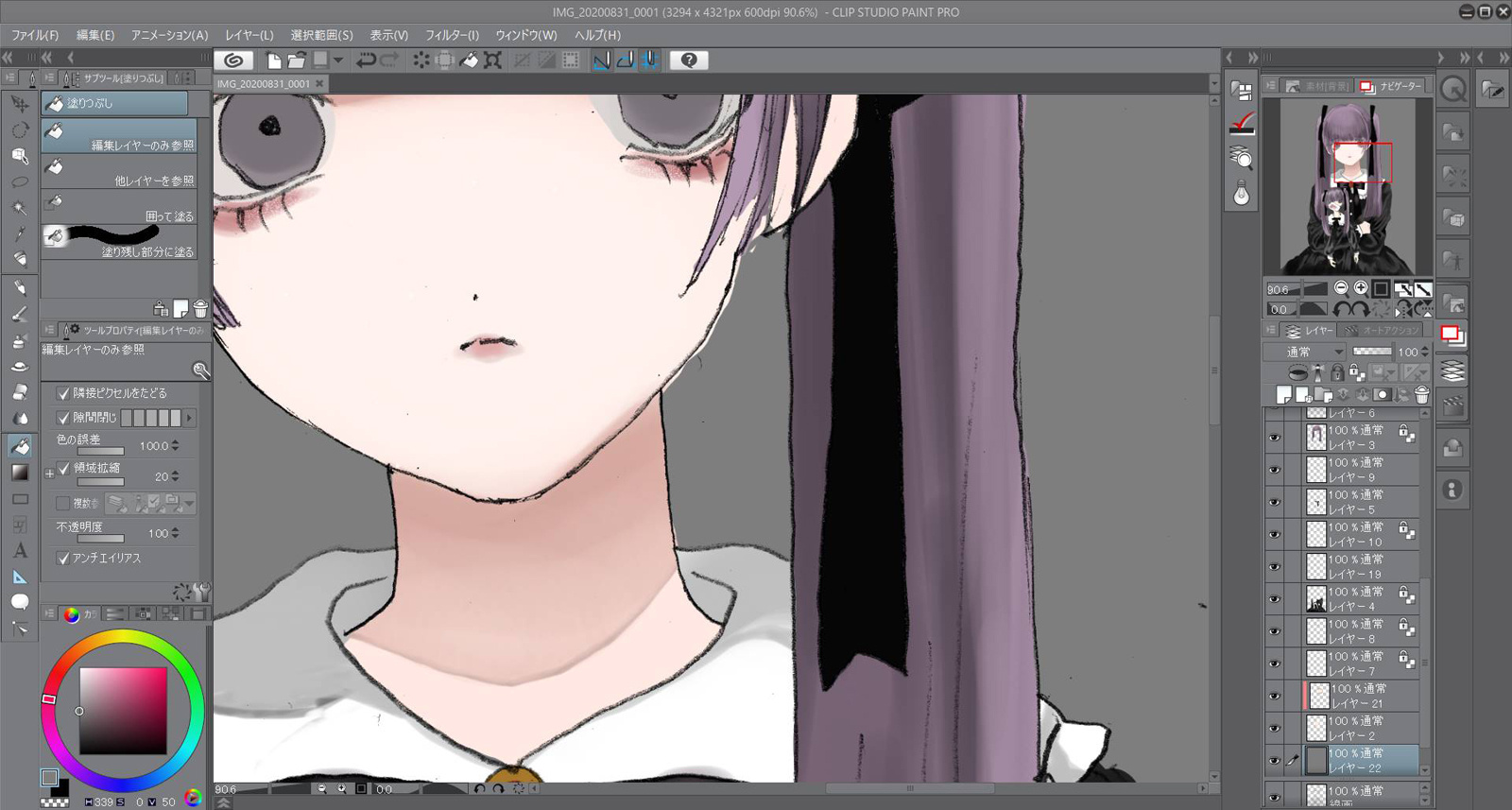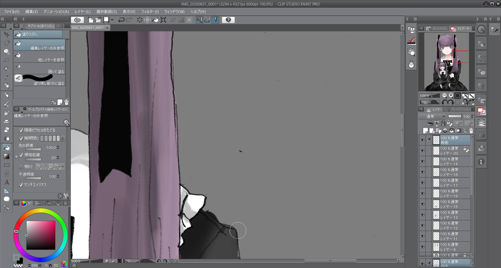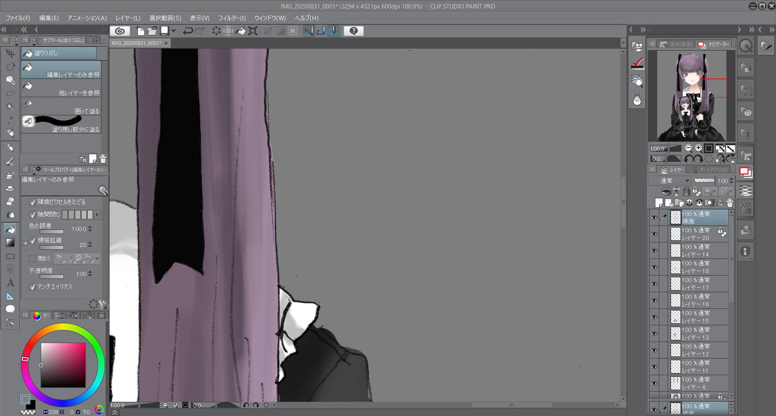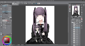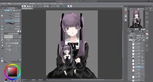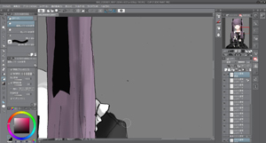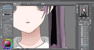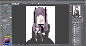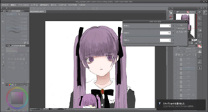 編集で輝度を透明度に変換を押して線画以外を透明にさせます。簡単に下塗りをして色を置いてイメージを整えます。今回は紫と黒をイメージして作りました。