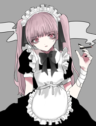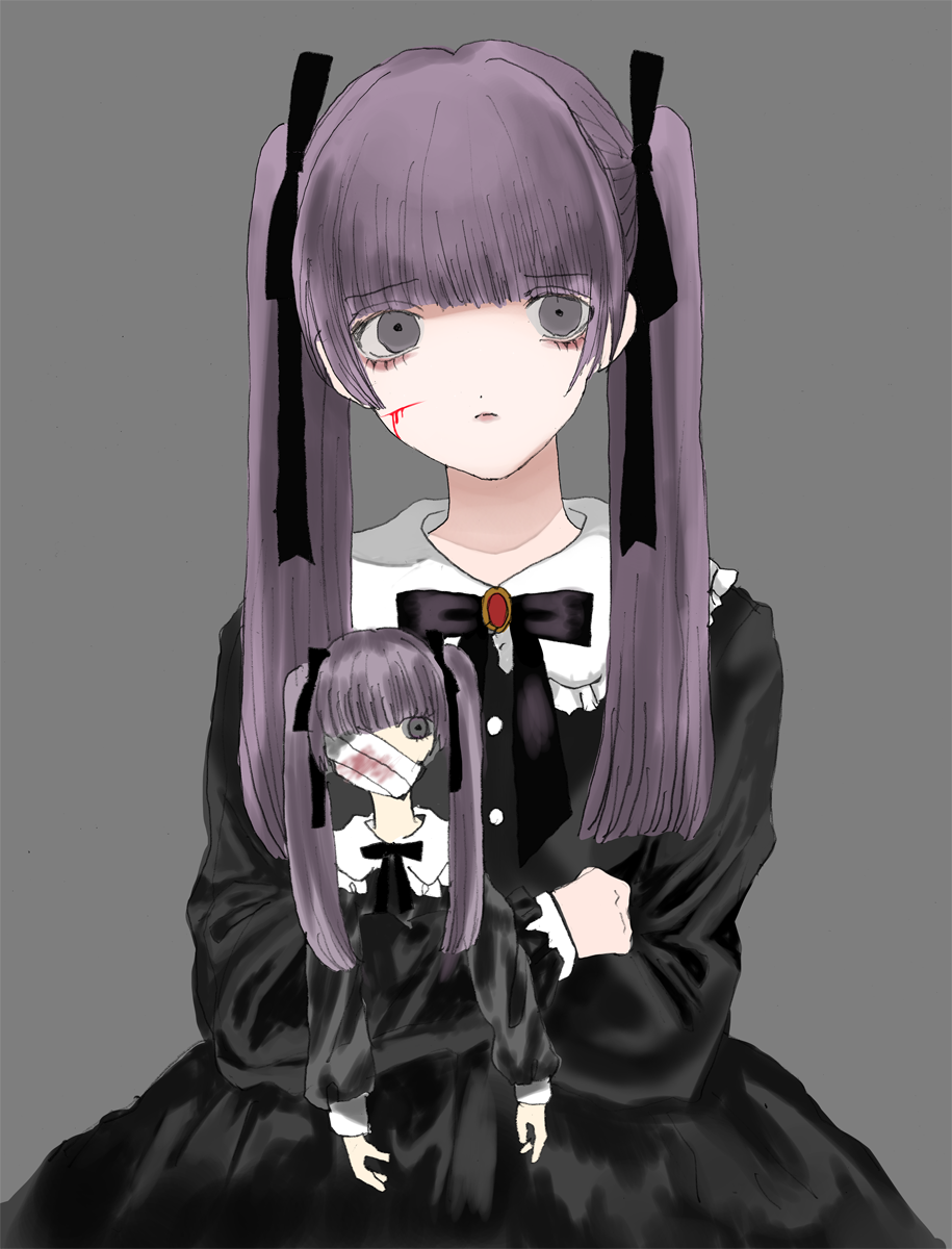 黒を映えさせるために明るめのグレーでシワを描き光沢感を出します。人形の包帯にもかるく赤のスプレーで血をつけます。背景をグレーにし雰囲気を調整します。髪の毛の紫とかぶらないためにグレーがかった瞳にしました。また、人形の包帯に赤を使ったので女の子にも赤の口紅を軽く塗りました。